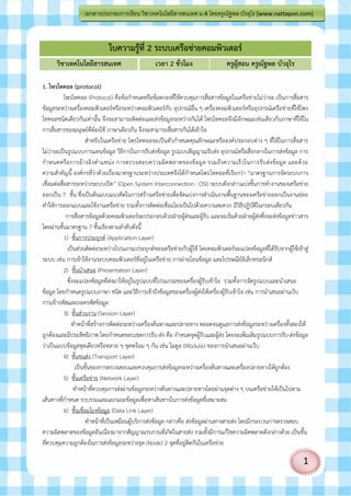 ม.4 โดยครูณฐพล บัวอุไร [www.nattapon.com] ั ใบความรู้ที่ 2 ระบบเครือข่ายคอมพิวเตอร์ วิชาเทคโนโลยีสารสนเทศ เวลา 2 ชั่วโมง ครูผสอน ครูณัฐพล บัวอุไร ู้ 1. โพรโตคอล (protocol) โพรโทคอล (Protocol) คือข้อกาหนดหรือข้อตกลงที่ใช้ควบคุมการสื่อสารข้อมูลในเครือข่ายไม่ว่าจะ เป็นการสื่อสาร ข้อมูลระหว่างเครื่องคอมพิวเตอร์หรือระหว่างคอมพิวเตอร์กับ อุปกรณ์อื่น ๆ เครื่องคอมพิวเตอร์หรืออุปกรณ์เครือข่ายที่ใช้โพร โทคอลชนิดเดียวกันเท่านั้น จึงจะสามารถติดต่อและส่งข้อมู ลระหว่างกันได้ โพรโทคอลจึงมีลักษณะเช่นเดียวกับภาษาที่ใช้ใน การสื่อสารของมนุษย์ที่ต้องใช้ ภาษาเดียวกัน จึงจะสามารถสื่อสารกันได้เข้าใจ สาหรับในเครือข่าย โพรโทคอลจะเป็นตัวกาหนดคุณลักษณะหรือองค์ประกอบต่าง ๆ ที่ใช้ในการสื่อสาร ไม่ว่าจะเป็นรูปแบบการแทนข้อมูล วิธีการในการรับส่งข้อมูล รูปแบบสัญญาณรับส่ง อุปกรณ์หรือสื่อกลางในการส่งข้อมูล การ กาหนดหรื อการอ้า งอิง ต าแหน่ ง การตรวจสอบความผิด พลาดของข้ อ มูล รวมถึ ง ความเร็ ว ในการรั บ ส่ง ข้ อ มูล และด้ ว ย ความสาคัญนี้ องค์กรที่ว่าด้วยเรื่องมาตรฐานระหว่างประเทศจึงได้กาหนดโพรโทคอลที่เรียกว่า “มาตรฐานการจัดระบบการ เชื่อมต่อสื่อสารระหว่างระบบเปิด” (Open System Interconnection : OSI) ระบบดังกล่าวแบ่งชั้นการทางานของเครือข่าย ออกเป็น 7 ชั้น ซึ่งเป็นต้นแบบแนวคิดในการสร้างเครือข่ายเพื่อจัดแบ่งการดาเนินงานพื้นฐานของเครือข่ายออกเป็นงานย่อย ทาให้การออกแบบและใช้งานเครือข่าย รวมทั้งการติดต่อเชื่อมโยงเป็นไปด้วยความสะดวก มีวิธีปฏิบัติในกรอบเดียวกัน การสื่อสารข้อมูลด้วยคอมพิวเตอร์จะประกอบด้ว ยฝ่ายผู้ส่งและผู้รับ และจะเริ่มด้วยฝ่ายผู้ส่งซึ่งจะส่งข้อมูลข่าวสาร โดยผ่านชั้นมาตรฐาน 7 ชั้นเรียงตามลาดับดังนี้ 1) ชั้นการประยุกต์ (Application Layer) เป็นส่วนติดต่อระหว่างโปรแกรมประยุกต์ของเครือข่ายกับผู้ใช้ โดยคอมพิวเตอร์จะแปลงข้อมูลที่ได้รับจากผู้ใช้เข้าสู่ ระบบ เช่น การเข้าใช้งานระบบคอมพิวเตอร์ที่อยู่ในเครือข่าย การถ่ายโอนข้อมูล และไปรษณีย์อิเล็กทรอนิกส์ 2) ชั้นนาเสนอ (Presentation Layer) ซึ่งจะแปลงข้อมูลที่ส่งมาให้อยู่ในรูปแบบที่โปรแกรมของเครื่องผู้รับเข้าใจ รวมทั้งการจัดรูปแบบและนาเสนอ ข้อมูล โดยกาหนดรูปแบบภาษา ชนิด และวิธีการเข้าถึงข้อมูลของเครื่องผู้ส่งให้เครื่องผู้รับเข้าใจ เช่น การนาเสนอผ่านเว็บ การเข้ารหัสและถอดรหัสข้อมูล 3) ชั้นส่วนงาน (Session Layer) ทาหน้าที่สร้างการติดต่อระหว่างเครื่องต้นทางและปลายทาง ตลอดจนดูแลการส่งข้อมูลระหว่างเครื่องทั้งสองให้ ถูกต้องและมี