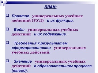 Документ описывает универсальные учебные действия (УУД) как обобщенные способы действий учащихся, направленные на самостоятельное усвоение знаний и развитие личностных качеств. Он выделяет различные виды УУД, их функции и значение в образовательном процессе, акцентируя внимание на важности формирования умений у учащихся. УУД должны быть основой для выбора содержания и методов обучения, способствуя успешному обучению и самосовершенствованию.