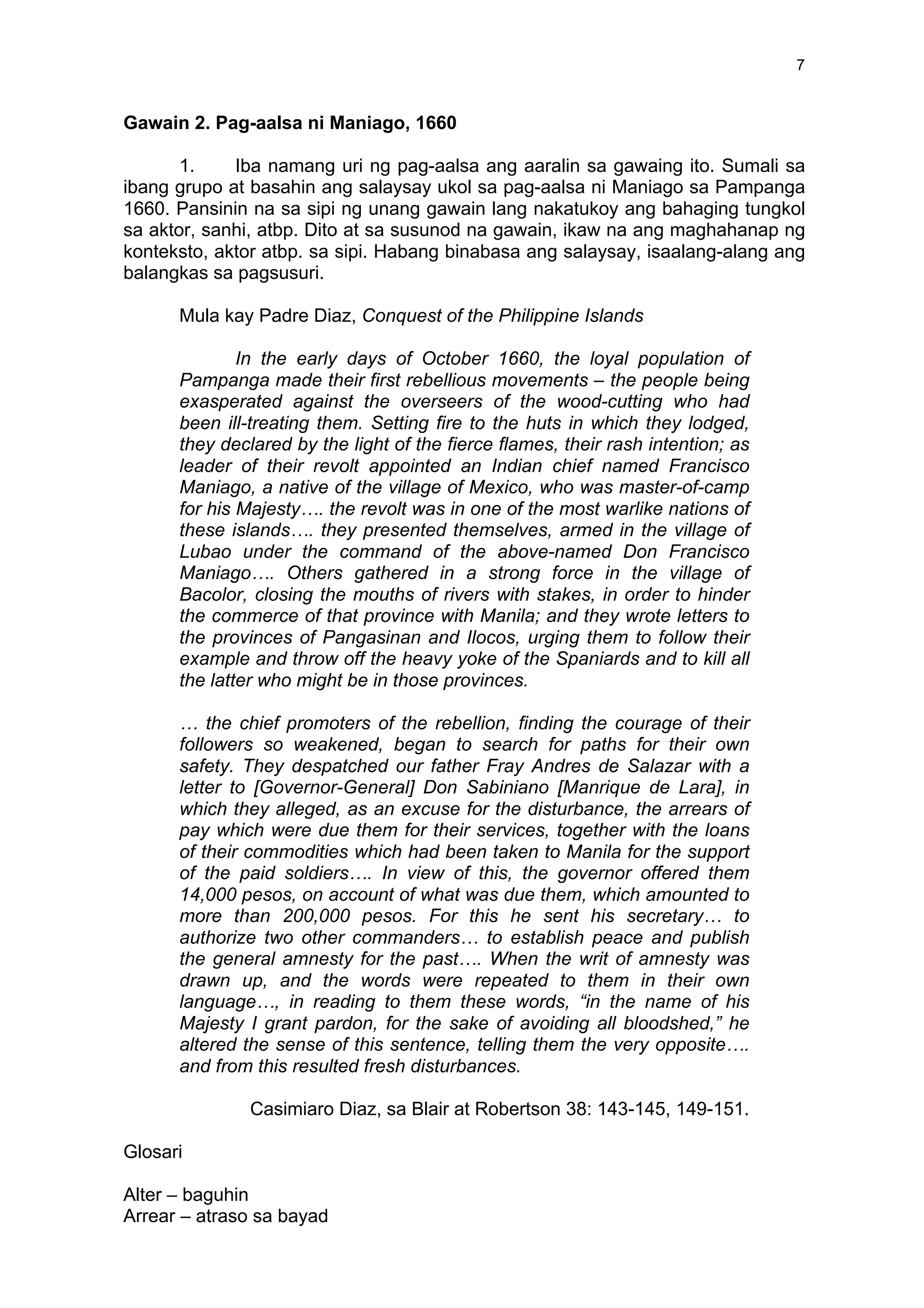 The document summarizes a rebellion led by Francisco Maniago in Pampanga, Philippines in 1660. The people of Pampanga grew exasperated with overseers who mistreated woodcutters. They set fire to huts and declared their intention to revolt, appointing Maniago as their leader. Others gathered armed in villages, closing river mouths to disrupt trade with Manila and urging other provinces to revolt against Spanish rule. As courage waned, leaders sought pardons while blaming unrest on unpaid wages. The governor offered payment but a secretary later altered the meaning of an amnesty, sparking further disturbances.