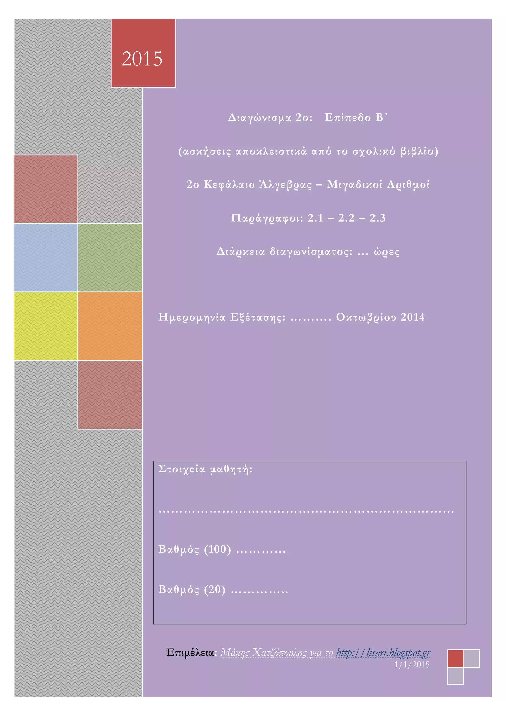 Διαγώνισμα 2ο: ΕπίπεδοΒ΄ (ασκήσεις αποκλειστικά από το σχολικό βιβλίο) 2ο Κεφάλαιο Άλγεβρας – Μιγαδικοί Αριθμοί Παράγραφοι: 2.1 – 2.2 – 2.3 Διάρκεια διαγωνίσματος: … ώρες