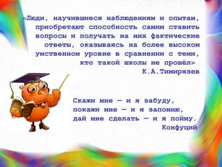 Документ рассматривает познавательно-исследовательскую деятельность детей через процесс экспериментирования, подчеркивая важность активного участия и самостоятельности детей в обучении. Устанавливаются цели и задачи для развития познавательной активности, эмоциональной сферы и интеллектуальных способностей детей, а также предлагаются методы и формы работы, способствующие обучению. Также делается акцент на необходимости подготовленных условий для экспериментирования и активного взаимодействия детей с окружающим миром.