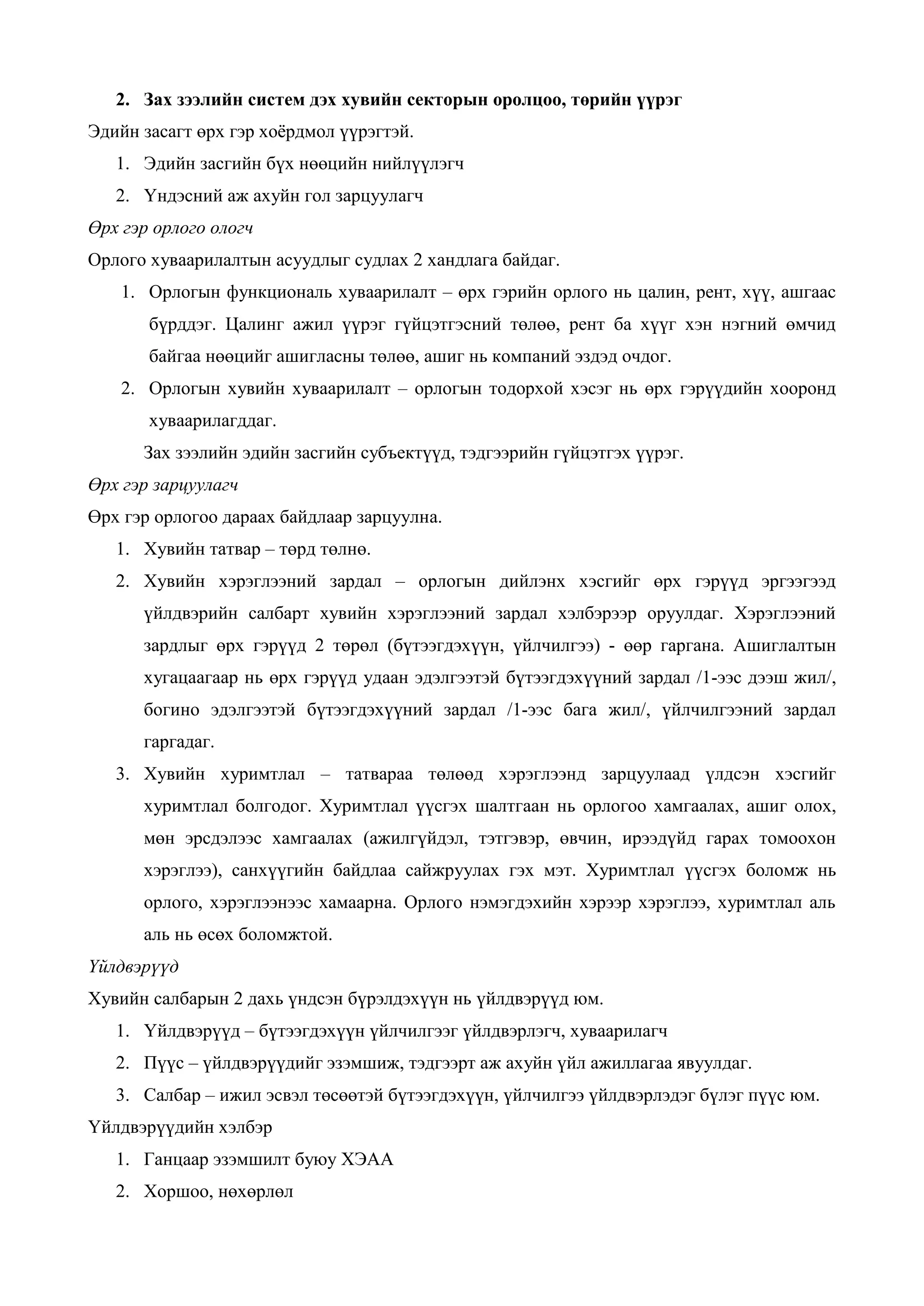 систем дэх хувийн секторын оролцоо, төрийн үүрэг Эдийн засагт өрх гэр хоѐрдмол үүрэгтэй. 1. Эдийн засгийн бүх нөөцийн нийлүүлэгч 2. Үндэсний аж ахуйн гол зарцуулагч Өрх гэр орлого ологч Орлого хуваарилалтын асуудлыг судлах 2 хандлага байдаг. 1. Орлогын функциональ хуваарилалт – өрх гэрийн орлого нь цалин, рент, хүү, ашгаас бүрддэг. Цалинг ажил үүрэг гүйцэтгэсний төлөө, рент ба хүүг хэн нэгний өмчид байгаа нөөцийг ашигласны төлөө, ашиг нь компаний эздэд очдог. 2. Орлогын хувийн хуваарилалт – орлогын тодорхой хэсэг нь өрх гэрүүдийн хооронд хуваарилагддаг. Зах зээлийн эдийн засгийн субъектүүд, тэдгээрийн гүйцэтгэх үүрэг. Өрх гэр зарцуулагч Өрх гэр орлогоо дараах байдлаар зарцуулна. 1. Хувийн татвар – төрд төлнө. 2. Хувийн хэрэглээний зардал – орлогын дийлэнх хэсгийг өрх гэрүүд эргээгээд үйлдвэрийн салбарт хувийн хэрэглээний зардал хэлбэрээр оруулдаг. Хэрэглээний зардлыг өрх гэрүүд 2 төрөл (бүтээгдэхүүн, үйлчилгээ) - өөр гаргана. Ашиглалтын хугацаагаар нь өрх гэрүүд удаан эдэлгээтэй бүтээгдэхүүний зардал /1-ээс дээш жил/, богино эдэлгээтэй бүтээгдэхүүний зардал /1-ээс бага жил/, үйлчилгээний зардал гаргадаг. 3. Хувийн хуримтлал – татвараа төлөөд хэрэглээнд зарцуулаад үлдсэн хэсгийг хуримтлал болгодог. Хуримтлал үүсгэх шалтгаан нь орлогоо хамгаалах, ашиг олох, мөн эрсдэлээс хамгаалах (ажилгүйдэл, тэтгэвэр, өвчин, ирээдүйд гарах томоохон хэрэглээ), санхүүгийн байдлаа сайжруулах гэх мэт. Хуримтлал үүсгэх боломж нь орлого, хэрэглээнээс хамаарна. Орлого нэмэгдэхийн хэрээр хэрэглээ, хуримтлал аль аль нь өсөх боломжтой. Үйлдвэрүүд Хувийн салбарын 2 дахь үндсэн бүрэлдэхүүн нь үйлдвэрүүд юм. 1. Үйлдвэрүүд – бүтээгдэхүүн үйлчилгээг үйлдвэрлэгч, хуваарилагч 2. Пүүс – үйлдвэрүүдийг эзэмшиж, тэдгээрт аж ахуйн үйл ажиллагаа явуулдаг. 3. Салбар – ижил эсвэл төсөөтэй бүтээгдэхүүн, үйлчилгээ үйлдвэрлэдэг бүлэг пүүс юм. Үйлдвэрүүдийн хэлбэр 1. Ганцаар эзэмшилт буюу ХЭАА 2. Хоршоо, нөхөрлөл