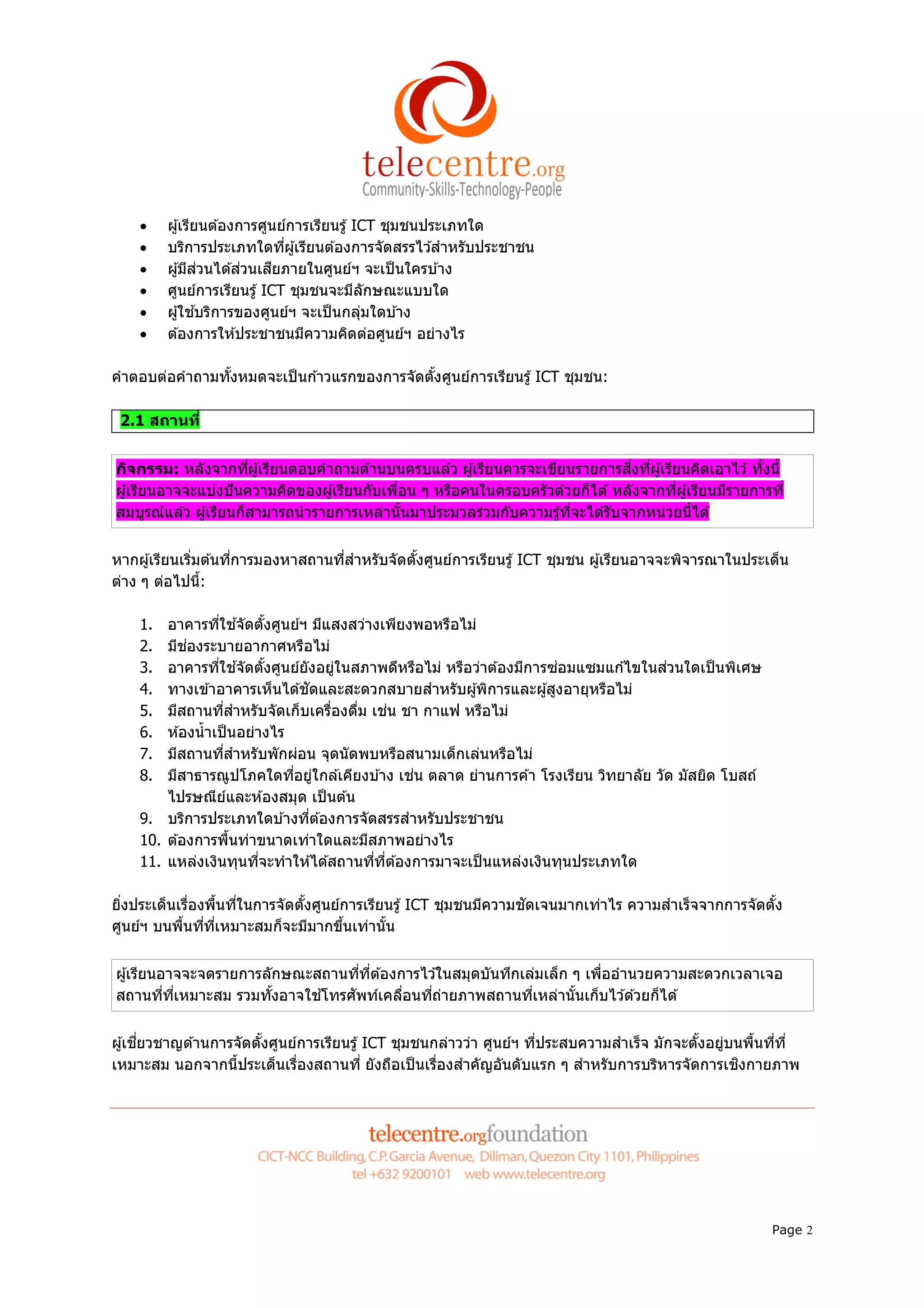 ้ ICT ชุมชน ตังอยูในพืนทีห่างไกล ก็อาจจะทําให ้ไม่มผู ้ไปใช ้บริการ อย่างไรก็ตาม ั ่ ี ในพืนทีชนบท ประชาชนมีความพร ้อมทีจะเดินทางไกลเพือไปใช ้บริการทีศูนย์ฯ หากบริการเหล่านันสามารถ ตอบสนองความต ้องการและความจําเป็ นต่าง ๆ ของพวกเขาได ้ นอกจากนียังมีบางประเด็นทีผู ้เรียนจะต ้องคํานึงถึงเวลาเลือกสถานทีเพือจัดตังศูนย์การเรียนรู ้ ICT ชุมชน: สถาบ ันทางศาสนา: หากศูนย์การเรียนรู ้ ICT ชุมชนของผู ้เรียนตังอยูในวัด มัสยิดหรือโบสถ์ ศาสนิกชนต่าง ่ ศาสนาก็อาจจะรู ้สึกไม่สะดวกสบายทีจะเข ้าใช ้บริการของศูนย์ฯ ในกรณีนี ผู ้เรียนอาจหาข ้อมูลทีเกียวข ้องได ้จาก การสอบถามบุคคลต่าง ๆ ในประเด็นดังกล่าว อาคารของหน่วยงานร ัฐ: ในบางครังประชาชนก็อาจจะรู ้สึกไม่สบายใจทีจะเข ้าไปในสถานทีทําการของรัฐเพือใช ้ บริการจากศูนย์การเรียนรู ้ ICT ชุมชน แต่ผู ้เรียนก็สามารถสอบถามประชาชนในประเด็นนีได ้ก่อน พืนทีแบ่งและหรือพืนทีบริจาค: ผู ้เรียนอาจจะต ้องใช ้พืนทีแบ่งให ้เช่าร่วมกับหน่วยงานภาคธุรกิจอืน ๆ หรือผู ้เรียน อาจจะได ้รับการบริจาคพืนทีมาโดยบุคคลหรือคณะบุคคลทีไม่ต ้องการใช ้พืนทีนันแล ้ว แต่จงจําไว ้ว่า พืนทีบริจาค อาจถูกเรียกคืนจากผู ้บริจาคได ้เสมอ ทีทําการไปรษณียและหน่วยงานทีมีล ักษณะเดียวก ัน: มีศนย์การเรียนรู ้ ICT ชุมชนจํานวนไม่น ้อยทีตังอยูใน ์ ู ่ พืนทีเดียวกับสํานั กบริการประชาชนต่าง ๆ เช่น ทีทําการไปรษณีย ์ ซึงจะก่อให ้เกิดปั ญหาเรืองการรองรับได ้ หากมี ผู ้ใช ้บริการจํานวนมาก ด ้วยเหตุนี ผู ้เรียนอาจจะต ้องมองหาสถานทีอืน ๆ ในชุมชนทีน่าจะมีความเหมาะสมมากกว่า บริการทีจําเปนอืน ๆ: เป็ นเรืองสําคัญทีจะต ้องตรวจสอบว่าสถานทีสําหรับจัดตังศูนย์การเรียนรู ้ ICT ชุมชนนันมี ็ ถนน ไฟฟ้ า นํ าประปาและสัญญาณโทรศัพท์เข ้าถึงหรือไม่ การแข่งข ัน: ผู ้เรียนอาจจะต ้องตรวจสอบว่ามีหน่วยงานเอกชนหรือวิสาหกิจอืน ๆ ทีให ้บริการลักษณะเดียวกับศูนย์ การเรียนรู ้ ICT ชุมชนหรือไม่ หากเป็ นเช่นนัน ศูนย์ฯ ของผู ้เรียนก็อาจจะต ้องเผชิญหน ้ากับการแข่งขัน ทังนีการ มองหาสถานทีตังอืน ๆ น่าจะมีความเหมาะสมมากกว่า การเข้าถึง: หากผู ้เรียนต ้องการให ้ศูนย์การเรียนรู ้ ICT ชุมชนเป็ นทีรู ้จักและมีผใช ้บริการจํานวนมาก ผู ้เรียนจะต ้อง ู หาสถานทีทีทุกคนสามารถเดินทางไปมาได ้อย่างสะดวก เช่น หากผู ้ใช ้บริการของศูนย์เป็ นผู ้สูงอายุ ก็ควรจะมีการ จัดทําทางลาดหรือราวจับบริเวณทางเดินเพืออํานวยความสะดวกให ้กับพวกเขา เป็ นต ้น คําถาม 2.1 1. บอกปั จจัย 3 ประการทีต ้องคํานึงถึงเวลามองห