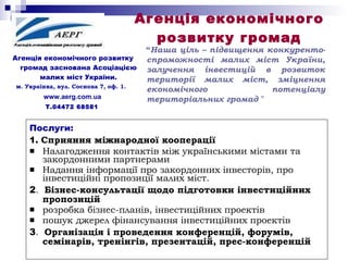 Агенція економічного розвитку громад Послуги: 1. Сприяння міжнародної кооперації Налагодження контактів між українськими містами та закордонними партнерами Надання інформації про закордонних інвесторів, про інвестиційні пропозиції малих міст. 2 . Бізнес-консультації щодо підготовки інвестиційних пропозицій розробка бізнес-планів, інвестиційних проектів пошук джерел фінансування інвестиційних проектів 3 . Організація і проведення конференцій, форумів, семінарів, тренінгів, презентацій, прес-конференцій Агенція економічного розвитку громад заснована Асоціацією малих міст України. м. Українка, вул. Соснова 7, оф. 1. www.aerg.com.ua Т.04472 68581 “ Наша ціль – підвищення конкуренто-спроможності малих міст України, залучення інвестицій в розвиток території малих міст, зміцнення економічного потенціалу територіальних громад ”