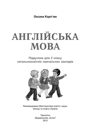This document is a textbook for teaching English to second grade students in Ukraine. It was published in 2012 by Aston Publishing in Ternopil, Ukraine. The textbook was developed based on a concept of positively motivating younger students to learn English. It contains educational materials that align with the curriculum guidelines for teaching English to second grade students set by the Ministry of Education and Science of Ukraine. The textbook is meant to be used as the main component of an instructional package and employs a communicative-game based methodology.