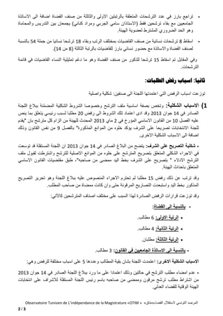 العدد الكلي لطلبات الترشح كان مرتفعًا، لكن قرابة 45% منها تم رفضها لأسباب شكلية. كما تم ملاحظة التراجع في عدد المرشحات النساء في مختلف الرتب القضائية.