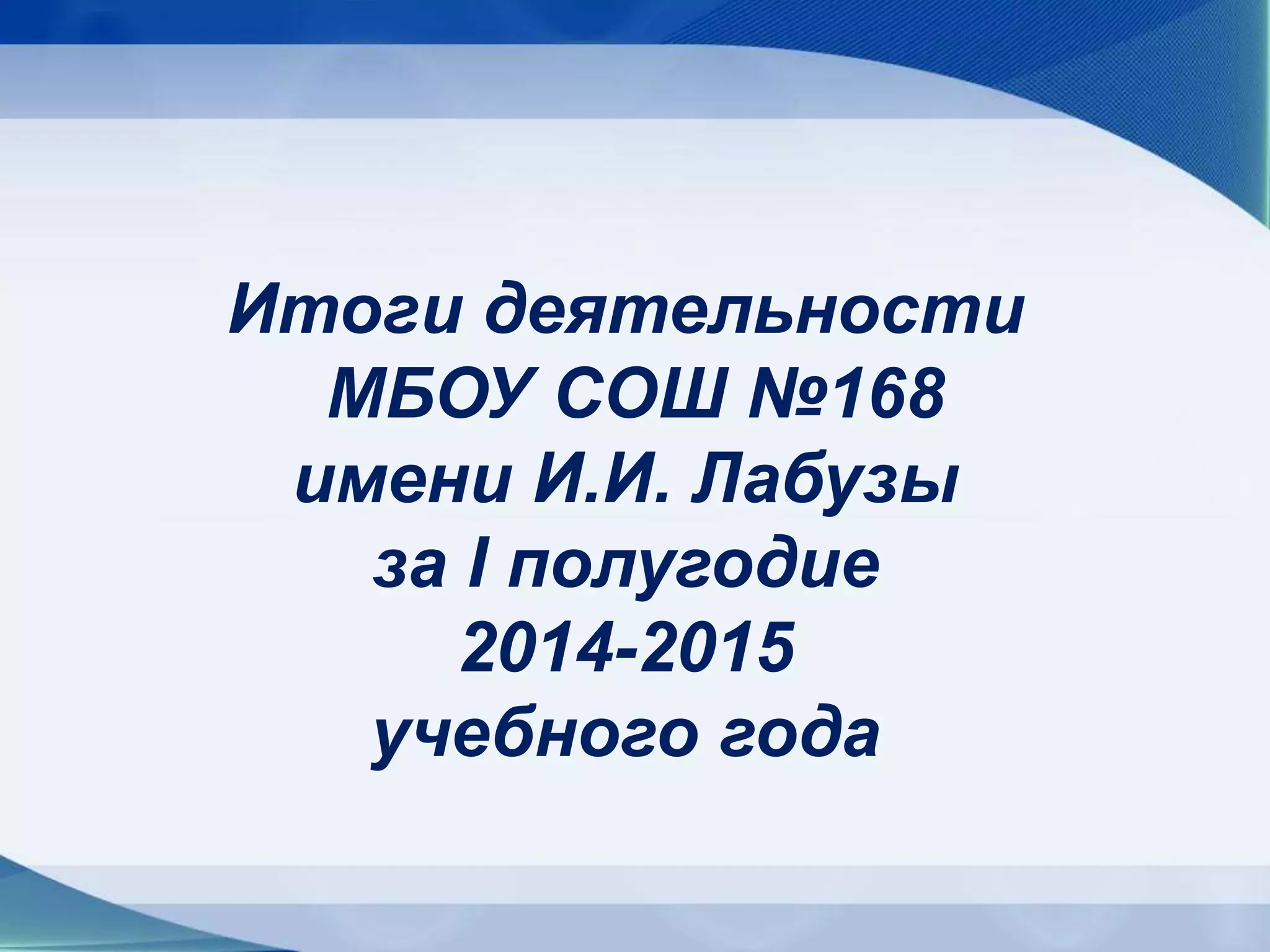 Документ содержит итоги деятельности МБОУ СОШ №168 имени И.И. Лабузы за I полугодие 2014-2015 учебного года, включая изменения в составе учащихся и показатели успеваемости. Общее количество учащихся увеличилось с 704 до 706, а уровень обученности составил 99,9%. Также представлены данные о качестве знаний по уровням образования и планах работы на будущие мероприятия.