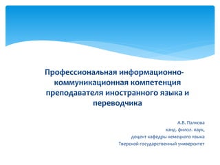 Документ обсуждает профессиональную информационно-коммуникационную компетенцию преподавателя иностранного языка и переводчика, акцентируя внимание на различных аспектах, таких как информационная грамотность и компетенции, необходимые для успешной педагогической деятельности. Описаны уровни владения информационно-коммуникационными компетенциями и основные компетенции переводчика, включая лингвистическую, операциональную и социокультурную. Также рассматриваются различные профили переводчиков и роли, которые они могут занимать.