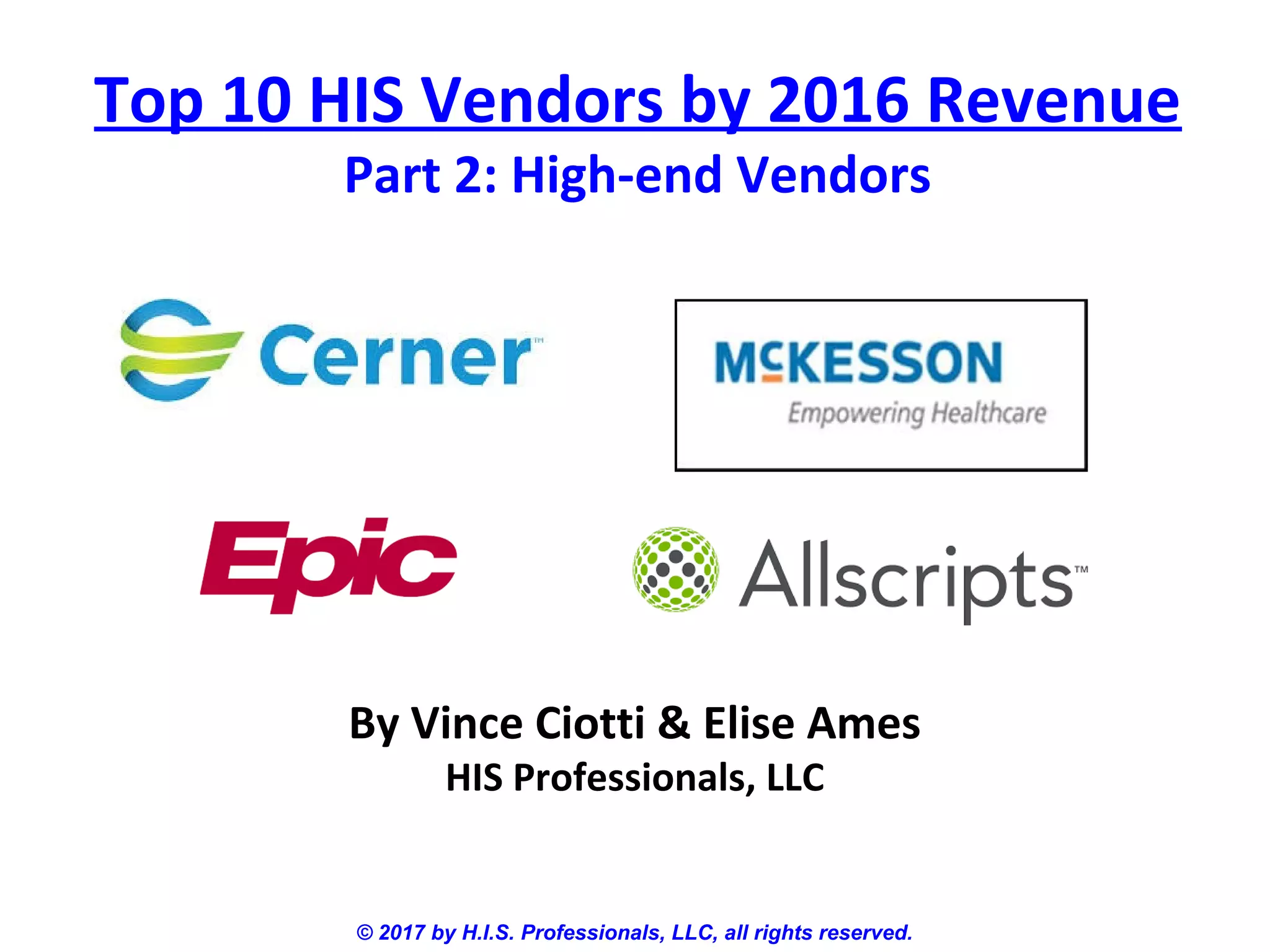This document discusses the top 10 healthcare IT vendors by 2016 revenue. It focuses on the high-end vendors with over $1.5 billion in revenue that primarily target large hospitals of 300+ beds. Cerner maintained the #1 spot with around $5 billion in revenue, an 8% increase over 2015. Epic was #2 with $2.5 billion in revenue, up 23%. Allscripts was #3 with $1.5 billion, a 12% increase. McKesson dropped to #4 with around $1.5 billion in revenue from its IT division, a 50% decline from selling off parts of its business. The document outlines recent developments and future prospects for each of these top vendors.