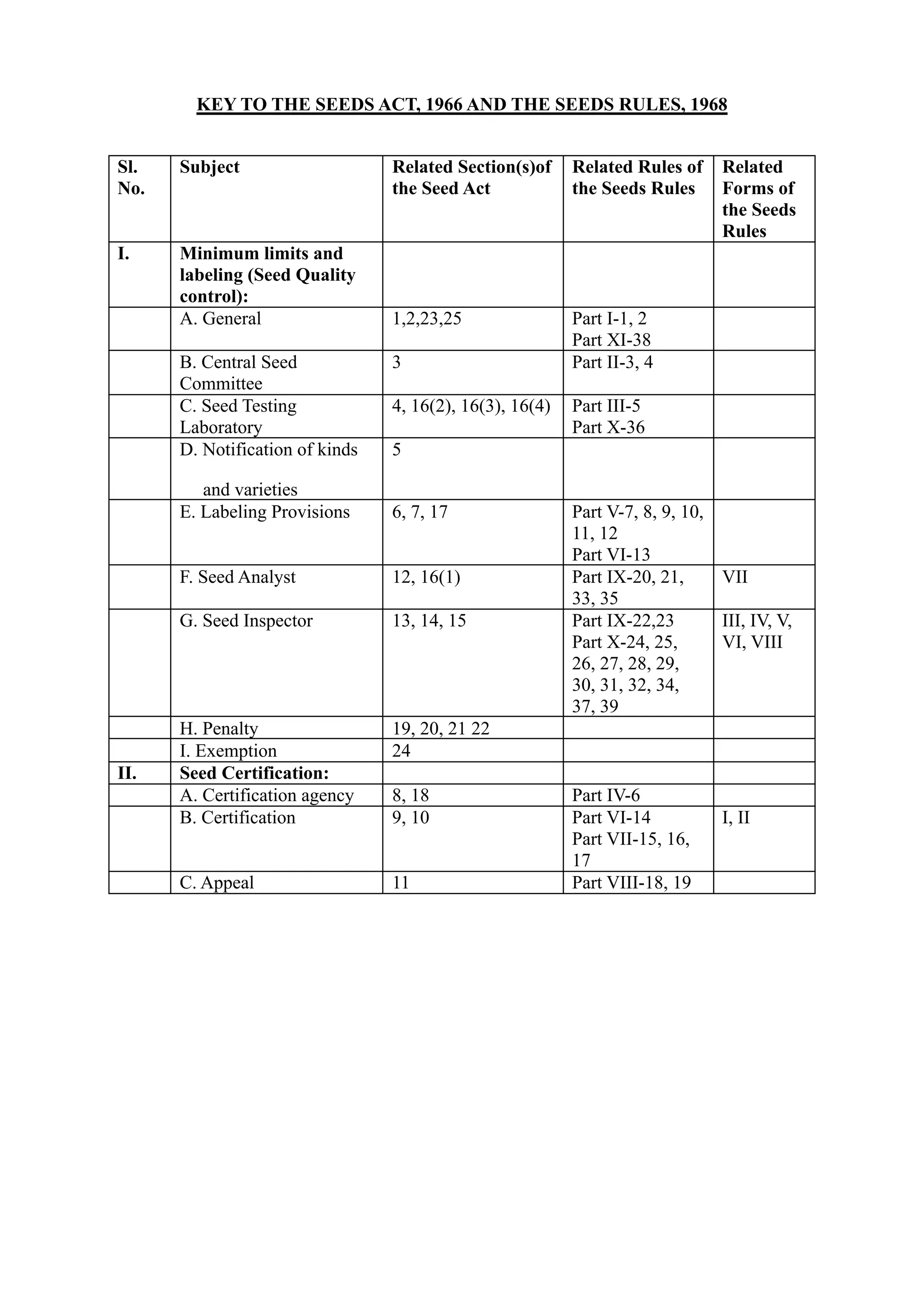 The document provides a summary of key sections of the Seed Act of 1966 and Seed Rules of 1968 related to seed quality control, certification, and enforcement in India. It outlines sections related to the central seed committee, seed testing laboratories, seed analyst, seed inspector, certification agencies, labeling requirements, penalties, and exemptions. The summary helps provide an overview of the various parts and forms within the Seed Act and Rules that govern minimum standards, certification, enforcement, and administration of seed quality in India.