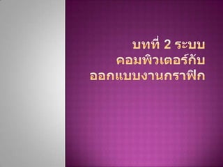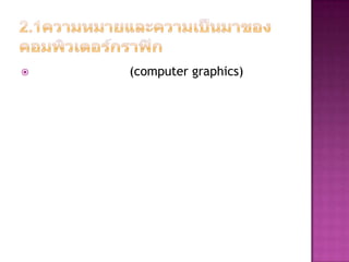 Computer graphics involve using a monitor and keyboard to display and interact with visual elements on screen. The monitor displays images and video while the keyboard allows users to provide input and control the computer. Together these components allow people to work with and manipulate graphical elements digitally.