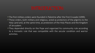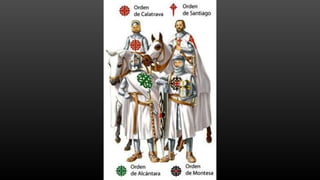 1) The Order of Calatrava, founded in 1158 to defend Christianity against Islam from their fortress in Calatrava. They grew in power and wealth over centuries until being annexed by the Crown.