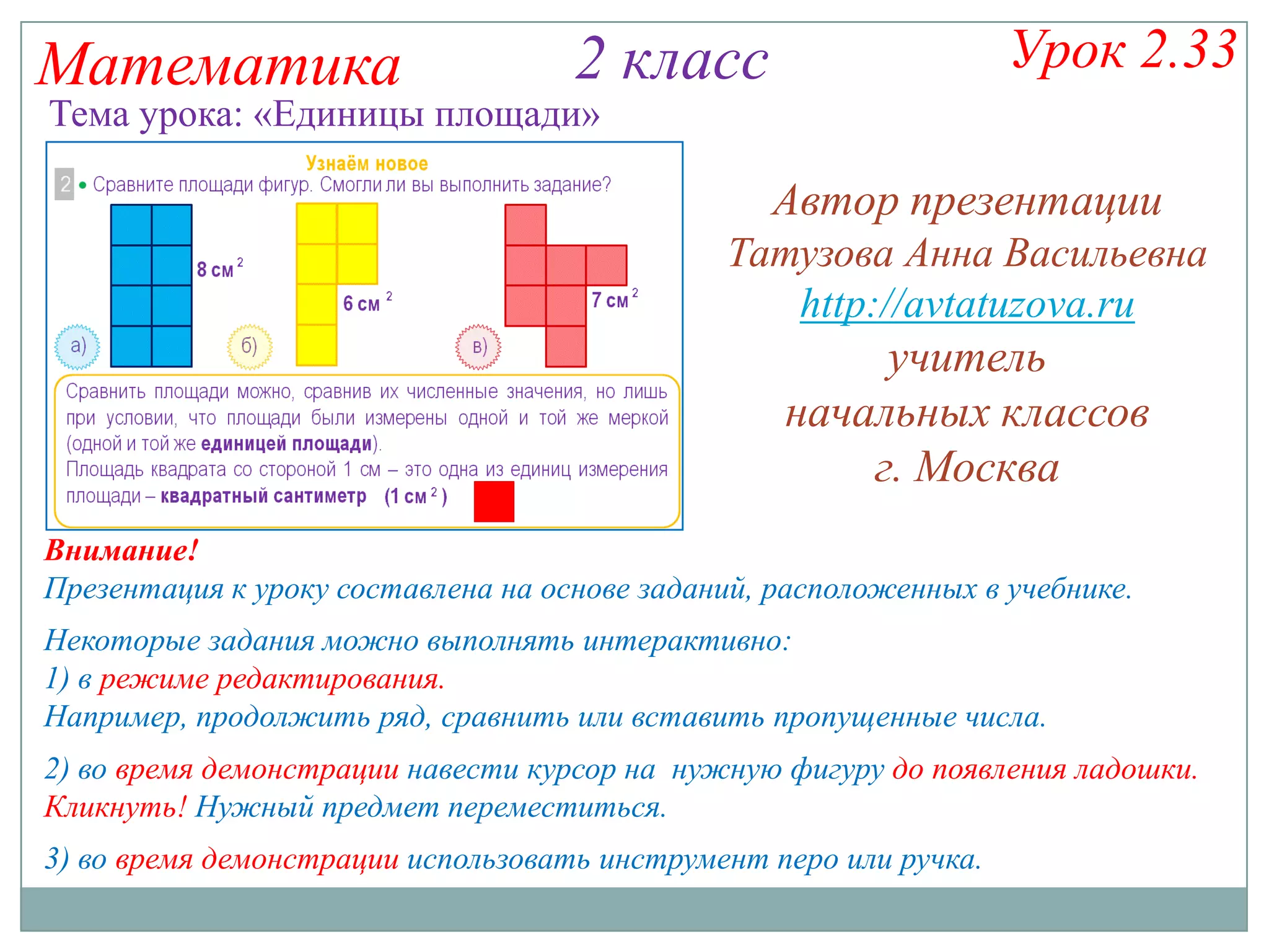 Документ представляет собой презентацию урока математики для 2 класса по теме 'единицы площади', разработанную учителем Анной Васильевной Татузовой. В уроке рассматривается понятие площади, методы измерения и сравнения площадей различных фигур с использованием квадратных сантиметров. Презентация также включает интерактивные задания для учащихся, направленные на освоение материала через практическое применение знаний.