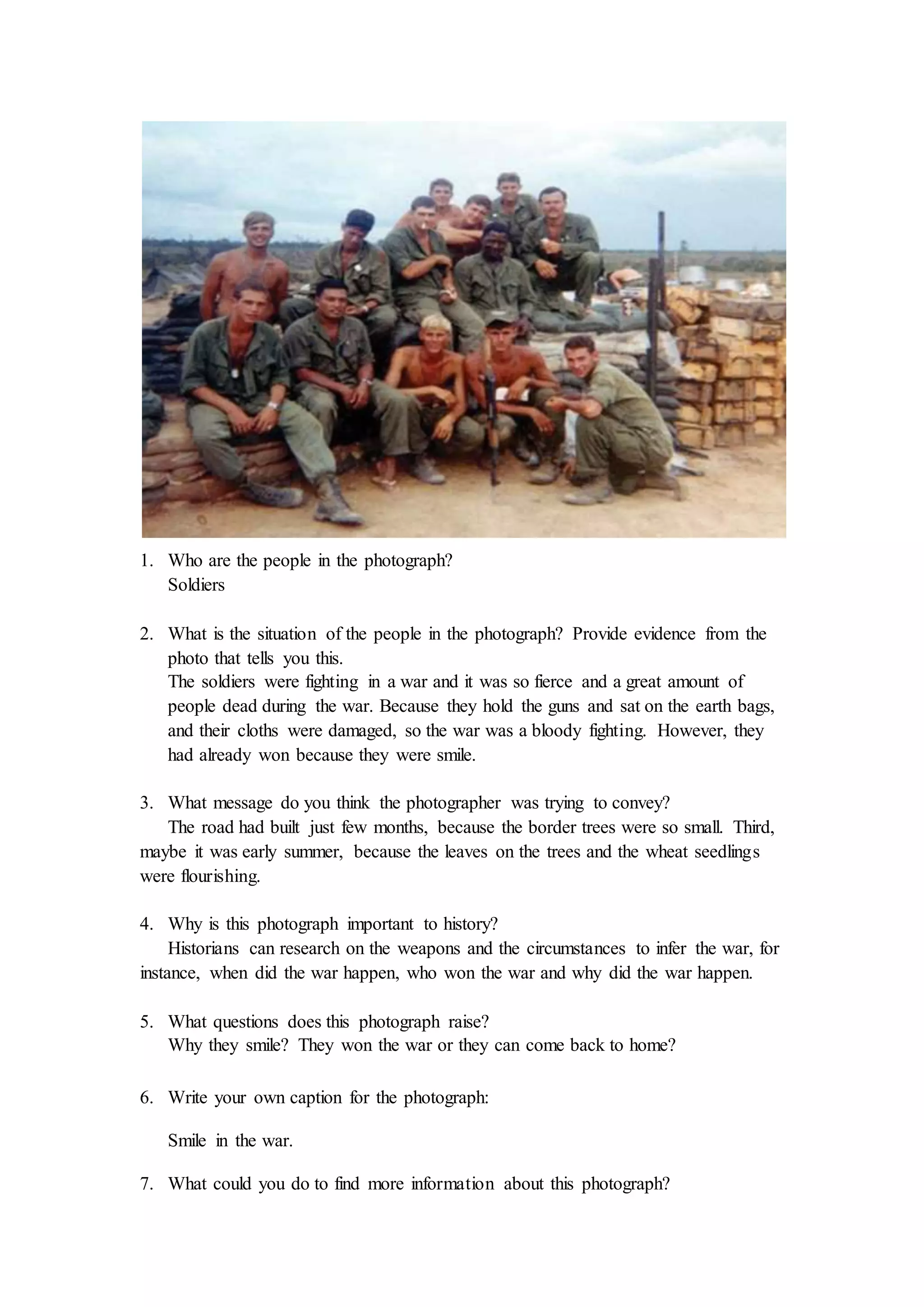 The photograph depicts soldiers smiling after a fierce battle during a war. Evidence of their situation includes damaged clothing and guns held while sitting on earth bags. The photographer aimed to convey that despite the bloody fighting, the soldiers were happy having won the battle. The photograph provides historians clues to research the war's weapons, circumstances, timing, and outcome.