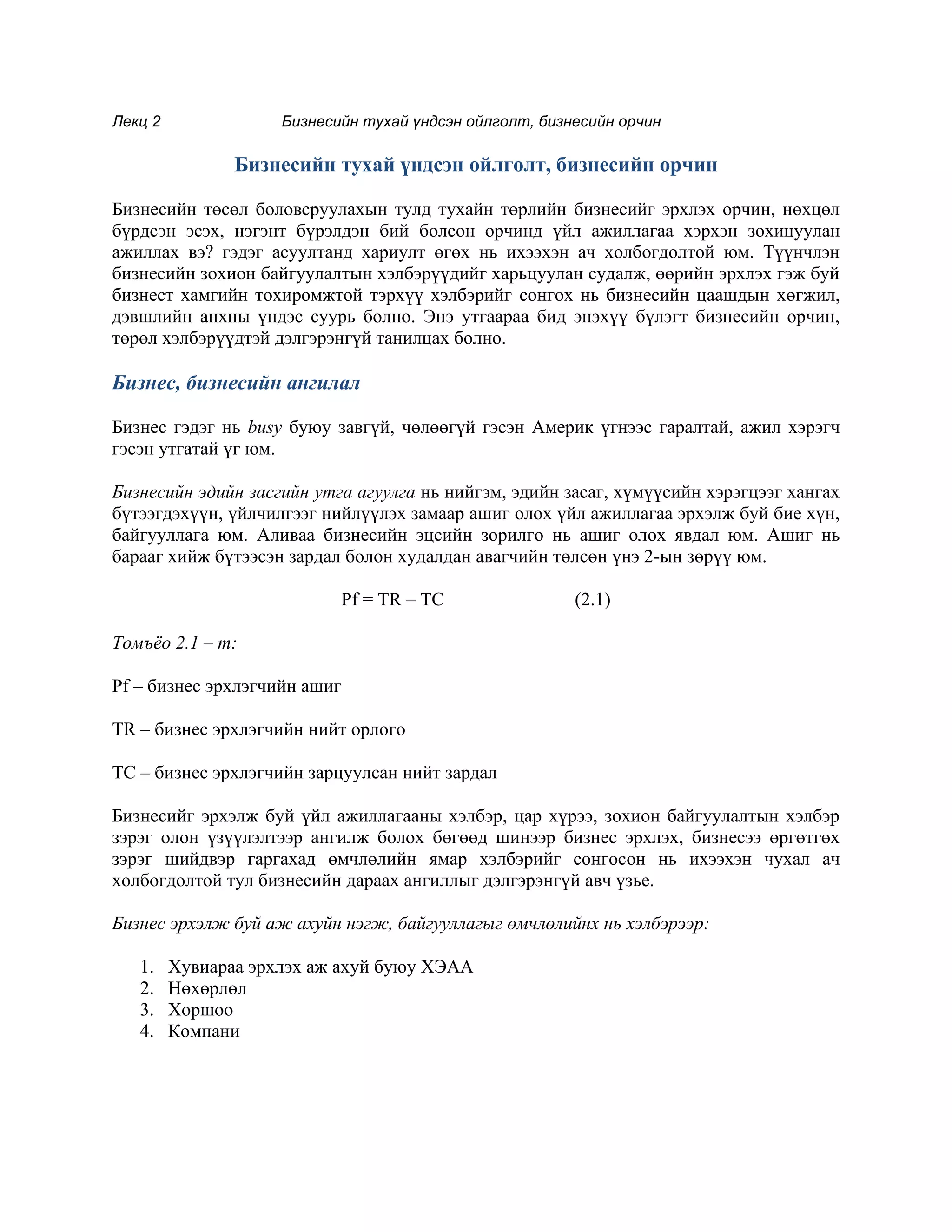 тухай үндсэн ойлголт, бизнесийн орчин Бизнесийн тухай үндсэн ойлголт, бизнесийн орчин Бизнесийн төсөл боловсруулахын тулд тухайн төрлийн бизнесийг эрхлэх орчин, нөхцөл бүрдсэн эсэх, нэгэнт бүрэлдэн бий болсон орчинд үйл ажиллагаа хэрхэн зохицуулан ажиллах вэ? гэдэг асуултанд хариулт өгөх нь ихээхэн ач холбогдолтой юм. Түүнчлэн бизнесийн зохион байгуулалтын хэлбэрүүдийг харьцуулан судалж, өөрийн эрхлэх гэж буй бизнест хамгийн тохиромжтой тэрхүү хэлбэрийг сонгох нь бизнесийн цаашдын хөгжил, дэвшлийн анхны үндэс суурь болно. Энэ утгаараа бид энэхүү бүлэгт бизнесийн орчин, төрөл хэлбэрүүдтэй дэлгэрэнгүй танилцах болно. Бизнес, бизнесийн ангилал Бизнес гэдэг нь busy буюу завгүй, чөлөөгүй гэсэн Америк үгнээс гаралтай, ажил хэрэгч гэсэн утгатай үг юм. Бизнесийн эдийн засгийн утга агуулга нь нийгэм, эдийн засаг, хүмүүсийн хэрэгцээг хангах бүтээгдэхүүн, үйлчилгээг нийлүүлэх замаар ашиг олох үйл ажиллагаа эрхэлж буй бие хүн, байгууллага юм. Аливаа бизнесийн эцсийн зорилго нь ашиг олох явдал юм. Ашиг нь барааг хийж бүтээсэн зардал болон худалдан авагчийн төлсөн үнэ 2-ын зөрүү юм. Pf = TR – TC (2.1) Томъёо 2.1 – т: Pf – бизнес эрхлэгчийн ашиг TR – бизнес эрхлэгчийн нийт орлого TC – бизнес эрхлэгчийн зарцуулсан нийт зардал Бизнесийг эрхэлж буй үйл ажиллагааны хэлбэр, цар хүрээ, зохион байгуулалтын хэлбэр зэрэг олон үзүүлэлтээр ангилж болох бөгөөд шинээр бизнес эрхлэх, бизнесээ өргөтгөх зэрэг шийдвэр гаргахад өмчлөлийн ямар хэлбэрийг сонгосон нь ихээхэн чухал ач холбогдолтой тул бизнесийн дараах ангиллыг дэлгэрэнгүй авч үзье. Бизнес эрхэлж буй аж ахуйн нэгж, байгууллагыг өмчлөлийнх нь хэлбэрээр: 1. Хувиараа эрхлэх аж ахуй буюу ХЭАА 2. Нөхөрлөл 3. Хоршоо 4. Компани