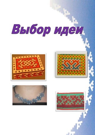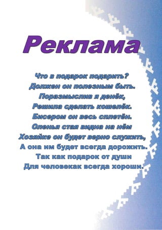 Документ содержит проект ученицы о создании кошелька в технике бисероплетения для подарка маме. Описание включает исторические аспекты бисера, используемые материалы и технологии, а также этапы работы и требования безопасности. Проект подчеркивает пользу бисероплетения как доступного и творческого вида деятельности, развивающего мелкую моторику и креативность.