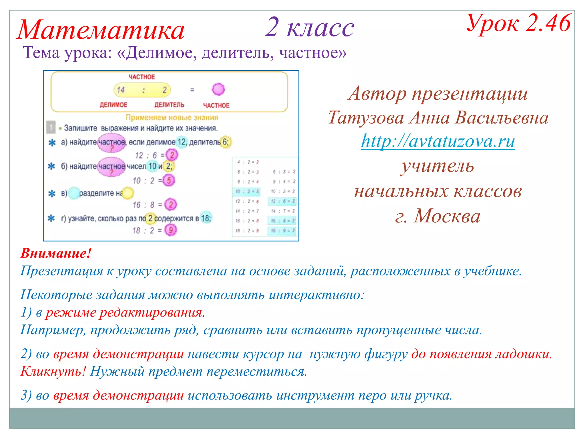Презентация для урока математики во 2 классе посвящена темам 'делимое, делитель, частное'. Урок включает интерактивные задания, такие как нахождение частного и решение задач с использованием простых делений. Учитель предоставляет примеры и задачи, которые можно выполнять в режиме редактирования для лучшего понимания темы.