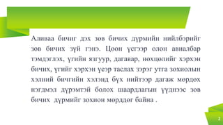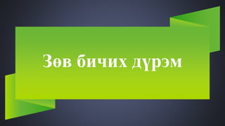 Аливаа бичиг дэх зөв бичих дүрмийн нийлбэрийг зөв бичих зүй гэнэ Цөөн үсгээр олон авиалбар тэмдэглэх, үгийн язгуур, дагавар, нөхцөлийг хэрхэн бичих, үгийг хэрхэн үеэр таслах зэрэг утга зохиолын хэлний бичгийн хэлэнд бүх нийтээр дагаж мөрдөх нэгдмэл дүрэмтэй болох шаардлагын үүднээс зөв бичих дүрмийг зохион мөрддөг байна.
