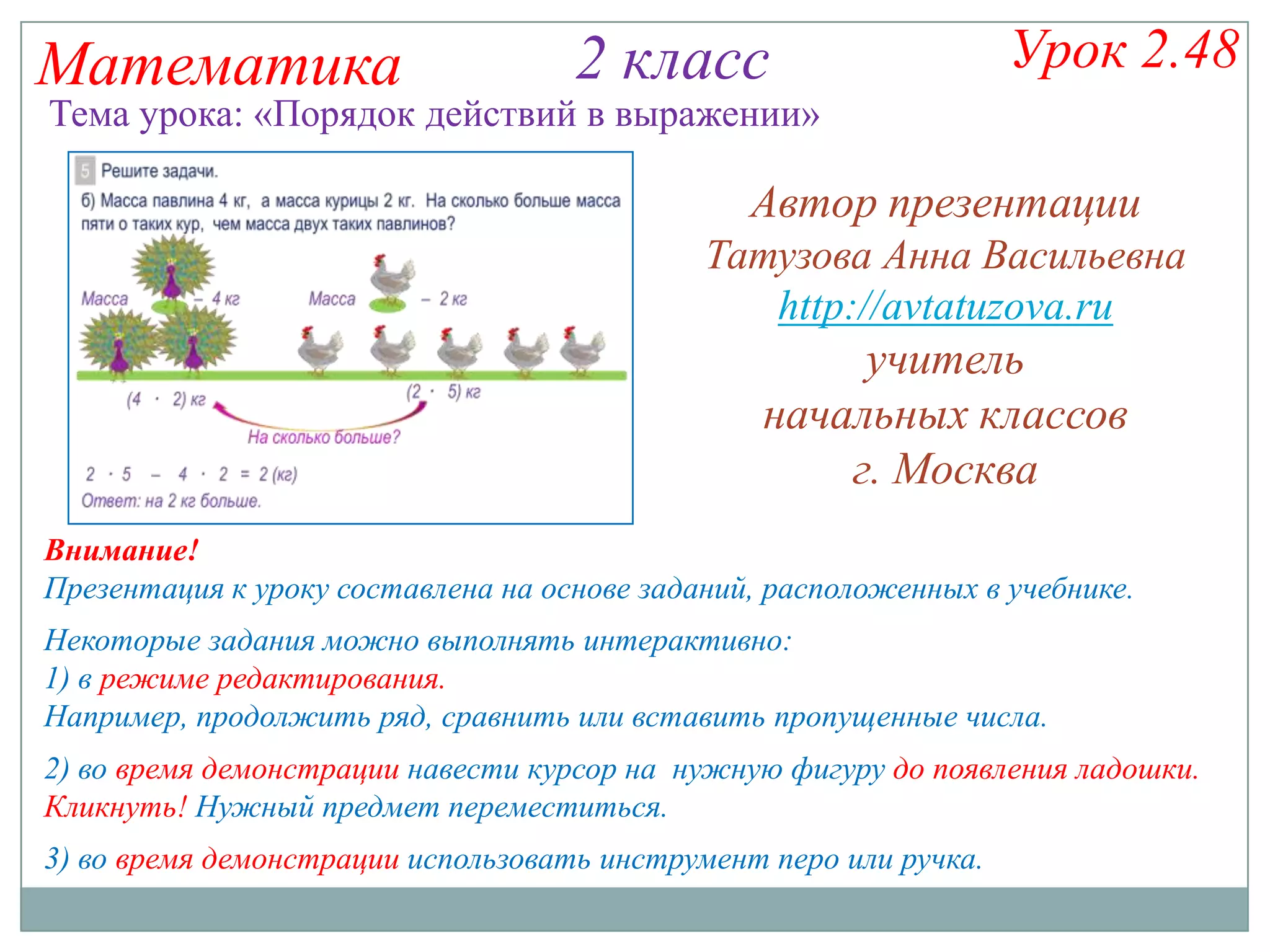 Документ представляет собой презентацию для урока математики во 2 классе с темой 'порядок действий в выражении'. В нем представлены задания для учащихся, включая интерактивные упражнения, которые помогают установить правильный порядок выполнения операций в математических выражениях. Также включены примеры задач и способов решения, чтобы ученики могли проверить свои знания о математических принципах.