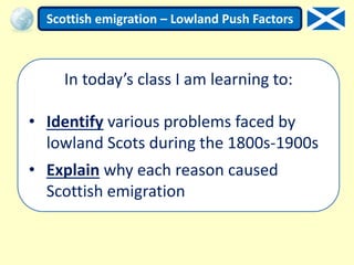 The document discusses various "push factors" that caused thousands of Scots to emigrate from the Lowlands (eastern, southern, and central Scotland) during the 1800s-1900s. It describes poor working conditions in factories, shipyards, and mines including long hours, lack of safety protections, low pay, and seasonal unemployment. It also notes problems of overcrowded and unsanitary housing, diseases like tuberculosis and cholera due to these conditions, and lack of public support for healthcare or unemployment. These poverty factors pushed many Lowland Scots to seek new lives elsewhere through emigration to escape these hardships.