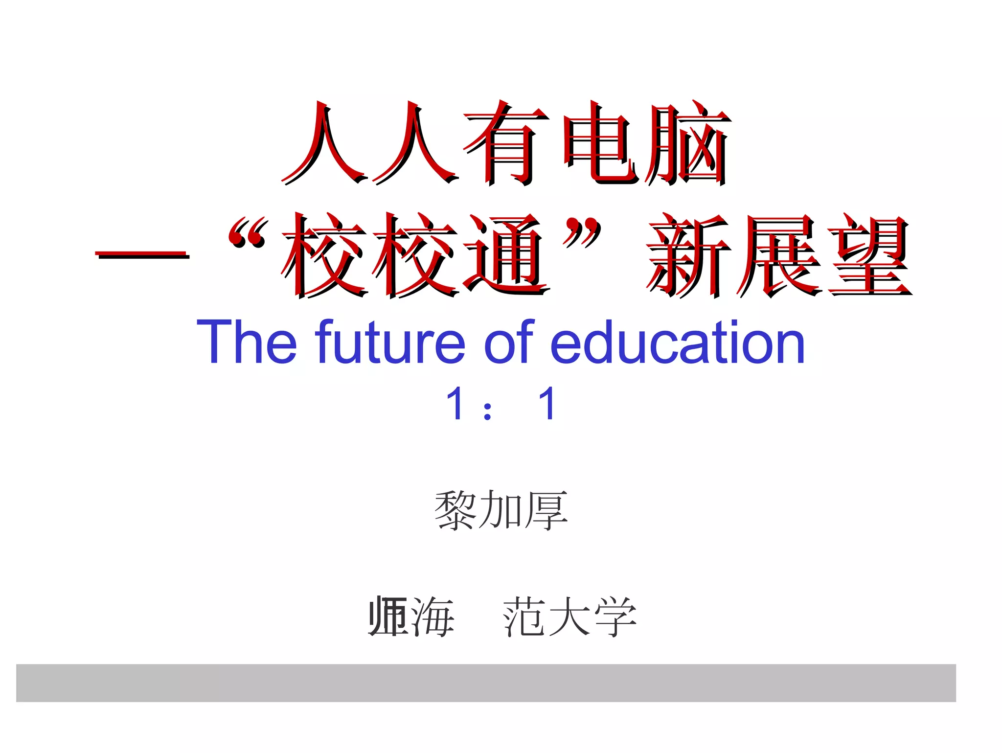 文档探讨了中国教育信息化的发展,特别是“校校通”工程的历史与目标。通过介绍低价计算机项目,如OLPC、Intel Classmate PC和华硕EEE PC,强调了计算机在促进教育平等与有效学习中的重要性。它还展望了未来教育的数字化转型和全球学习方式的革命性变化。