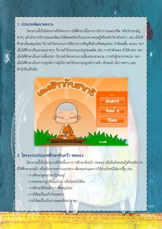 ขอบข่ายและประเภทของโครงงาน ขอบข่ายของโครงงาน ขอบข่ายของโครงงาน การดาเนินงานโดยมีนักเรียนเป็นผู้ริเริ่มสร้างสรรค์ และครูอาจารย์เป็น ผู้ให้คาแนะนาปรึกษา สรุปได้ดังนี้คือ 1. เป็นกิจกรรมการศึกษาที่ให้นักเรียนศึกษา ค้นคว้า ปฏิบัติด้วยตนเอง โดยอาศัยหลักวิชาการ ทางทฤษฎีตามเนื้อหาโครงงานนั้นๆ หรือจากประสบการณ์ และกิจกรรมต่างๆ ที่ได้พบเห็นมาแล้ว 2. นักเรียนทุกคนเป็นผู้พิจารณาจัดทาโครงงานด้วยตนเอง หรือกลุ่ม จานวน 2-8 คน ต่อกลุ่ม โดยใช้ระยะเวลาสั้นๆ เป็นภาคเรียน หรือมากกว่าก็ได้ 3. นักเรียนเป็นผู้พิจารณาริเริ่มสร้างสรรค์ คัดเลือกโครงงานที่จะศึกษาค้นคว้า ปฏิบัติด้วย ตนเองตามความถนัด สนใจและความพร้อม 4. นักเรียนเป็นผู้เสนอโครงงาน รายละเอียดของโครงงานแผนปฏิบัติงาน และแปรผลรายงาน ต่อครูอาจารย์ที่ปรึกษา เพื่อดาเนินงานร่วมกันให้บรรลุตาจุดหมายที่กาหนด 5. เป็นโครงงานที่เหมาะสมกับความรู้ ความสามารถของนักเรียนตามวัยและสติปัญญา รวมทั้ง การใช้จ่ายเงินดาเนินงานด้วย โครงงานประเภทต่างๆ การแบ่งประเภทของโครงงานมีหลายวิธี เช่น แบ่งตามหมวดวิชาการงานและอาชีพในโรงเรียน เช่น โครงงานเกษตรกรรม โครงงานคหกรรม โครงงานอุตสาหกรรม โครงงานวิทยาศาสตร์ เป็นต้น และจากขอบข่ายโครงงานดังกล่าว จะเห็นได้ว่านักเรียนเป็นผู้ดาเนินงาน โดยได้รับคาแนะนาจาก อาจารย์ที่ปรึกษาโครงงาน และนักเรียนลงมือปฏิบัติด้วยตนเอง ทั้งด้านการเสนอโครงงาน ขั้นตอนการ ปฏิบัติงาน ตลอดจนทาแผนปฏิบัติการ และรายงานผลตามจุดมุ่งหมายที่กาหนดไว้ ทาให้สามารถแยก ประเภทของโครงงานได้ 4 ประเภท ดังนี้คือ 1. ประเภทพัฒนาผลงาน 2. ประเภทศึกษา ค้นคว้า ทดลอง 3. ประเภทสิ่งประดิษฐ์ 4. ประเภทสารวจข้อมูล