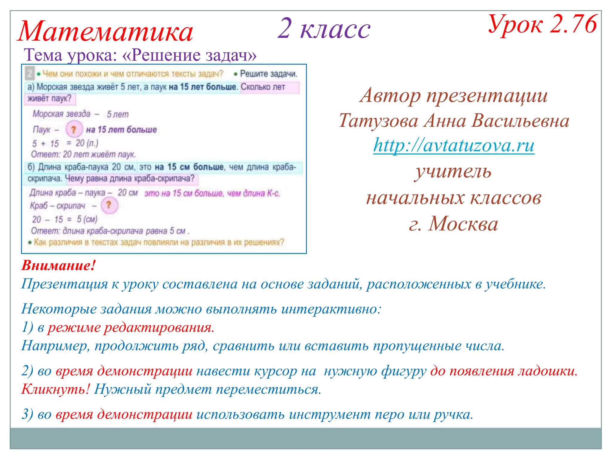 Документ представляет собой презентацию для учителей начальных классов по математике, в которой описываются интерактивные задания для учеников 2 класса, касающиеся решения задач. Включены примеры задач с данными и ответами, а также указания на использование интерактивных инструментов при обучении. Основная тема урока — решение задач и умение находить значения выражений при заданных переменных.