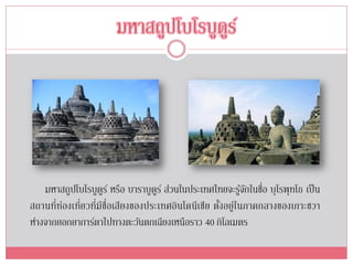 ส่วนในประเทศไทยจะรูจกในชือ บุโรพุทโธ เป็ น ้ั ่ สถานที่ท่องเที่ยวที่มีชื่อเสียงของประเทศอินโดนีเซีย ตังอยู่ในภาคกลางของเกาะชวา ้ ห่างจากยอกยาการ์ตาไปทางตะวันตกเฉียงเหนือราว 40 กิโลเมตร