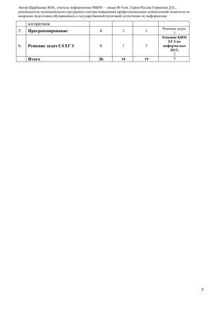 Документ представляет учебный план дополнительной профессиональной образовательной программы для повышения профессиональной компетентности учителей информатики в подготовке учеников к ЕГЭ и ГИА. Программа длится 36 часов и включает темы, такие как структура ЕГЭ и ГИА, технологии подготовки, системы счисления и элементарные алгоритмы. Основная цель программы - улучшение качества подготовки учителей для успешной подготовки учащихся к итоговой аттестации.