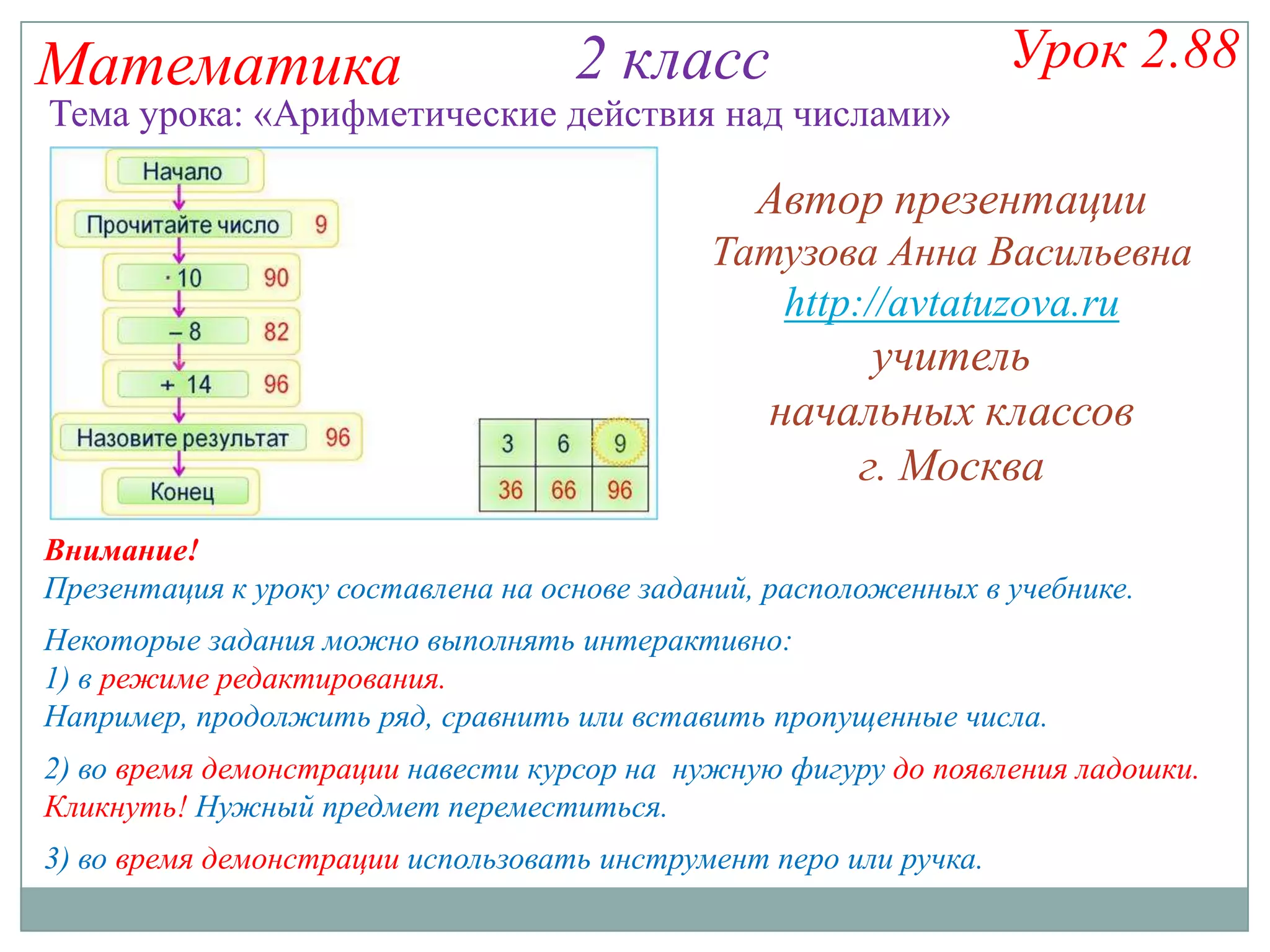 Документ содержит методические указания для учителей по интерактивному проведению уроков математики для 2 класса, включая темы арифметических действий с числами. Приводятся примеры заданий с пошаговыми инструкциями и алгоритмами, а также рекомендации по использованию интерактивных инструментов на уроках. Основное внимание уделяется практике работы с числовыми рядами, уравнениями и единицами измерения.