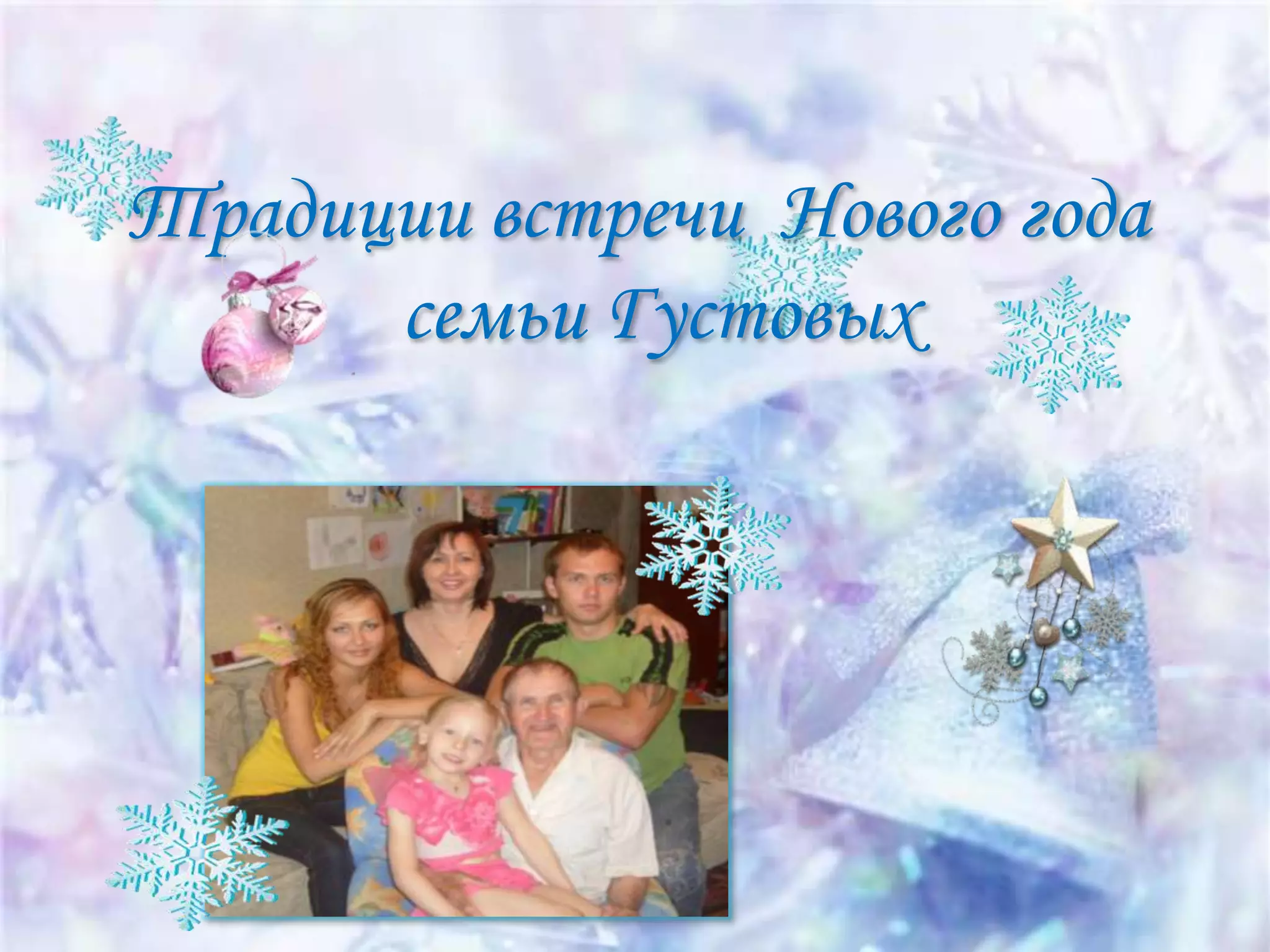 Документ описывает традиции встречи Нового года в семье Густовых, подчеркивая важность этого праздника и его особенные обряды. В семье каждый год наряжают елку, делают игрушки и создают новогодние наряды, что создает атмосферу волшебства и счастья. Праздник отмечается с фейерверками и совместными прогулками, принося здоровье и радость в дом.