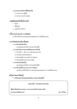 วต ั ิ ) กระบวนการปฏิบติ ั 2) กระบวนการทํางานกลุ่ม 5.คุณลักษณะอันพึงประสงค์ 1. มีวนย ิ ั 2. ใฝ่ เรี ยนรู ้ 3. มุ่งมันในการทํางาน 6.ชินงาน/ภาระงาน (รวบยอด) การโต้วาที เรื อง ความเสมอภาคทางเพศและการวางตัวทีเหมาะสม 7.การวัดและการประเมินผล . การประเมินก่ อนเรียน - แบบทดสอบก่อนเรี ยน หน่วยการเรี ยนรู ้ที 3 . การประเมินระหว่ างการจัดกิจกรรมการเรียนรู้ ) ใบงานที . เรื อง การวางตัวอย่างเหมาะสม ) ประเมินการนําเสนอผลงาน ) สังเกตพฤติกรรมการทํางานรายบุคคล ) สังเกตพฤติกรรมการทํางานกลุ่ม . การประเมินหลังเรียน - แบบทดสอบหลังเรี ยน หน่วยการเรี ยนรู ้ที . การประเมินชิ นงาน/ภาระงาน (รวบยอด) - ประเมินการโต้วาที เรื อง ความเสมอภาคทางเพศและการวางตัวทีเหมาะสม 8.กิจกรรมการเรียนรู้ นักเรี ยนทําแบบทดสอบก่ อนเรียน หน่ วยการเรียนรู้ ที 3 กิจกรรมที ความเสมอภาคทางเพศ วิธีสอนโดยเน้ นกระบวนการ : กระบวนการสร้ างความตระหนัก, กระบวนการคิดวิเคราะห์ เวลา ชั วโมง 57