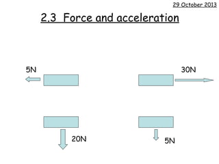 The document discusses force, acceleration, and their relationship. It includes diagrams of experiments measuring the effect of increasing force and mass on the acceleration of a trolley. The results demonstrate that acceleration increases as force increases, and decreases as mass increases. The proportional and inverse proportional relationships between force and acceleration, and mass and acceleration respectively, are explained.