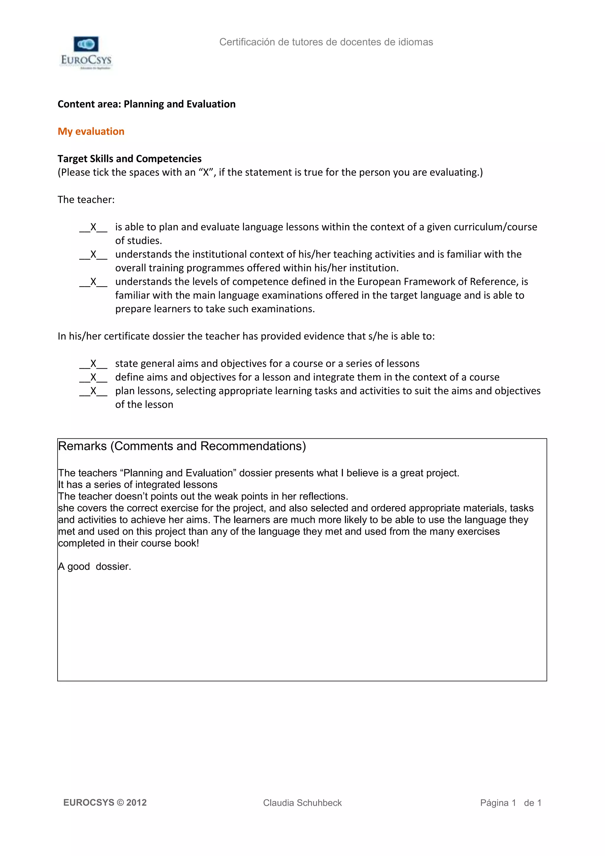 The evaluator remarks that the teacher's planning and evaluation dossier presents a