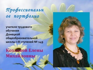 Документ представляет профессиональное портфолио Елены Михайловны Козловой, учителя трудового обучения Донецкой общеобразовательной школы № 149 с 19-летним педагогическим стажем. Она имеет квалификационную категорию «старший учитель» и активно участвует в профессиональных сообществах и конкурсах. В портфолио также описаны ее методические подходы, проекты и увлечения, включая освоение рукоделия и использование интерактивных технологий в обучении.