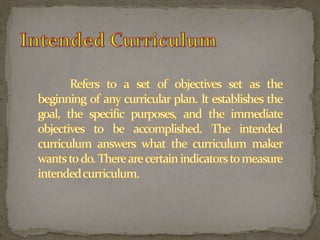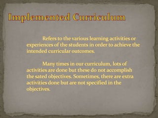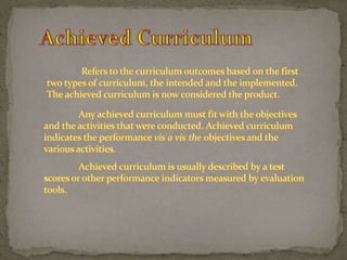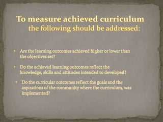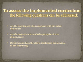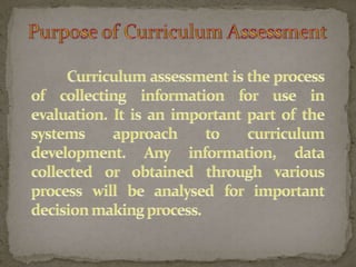 The document outlines steps for effective curriculum development and assessment, including highlighting expectations, gathering student information, motivating learning, obtaining feedback, and measuring outcomes. It stresses the importance of linking different parts of the curriculum to avoid gaps that weaken connections and hinder accomplishing curriculum goals. Curriculum assessment is planned in advance and conducted to accomplish various objectives, with learning outcomes measured by student performance.
