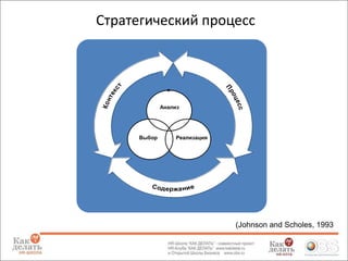 Документ описывает процесс стратегического анализа, выделяя ключевые элементы успешной стратегии, уровни стратегии, а также методы анализа внешней и отраслевой среды. Он включает обсуждение моделей, таких как матрица Ансоффа и 5 сил Портера, а также ресурсный подход к выбору стратегии. Рассматриваются важность оценки ресурсов и способностей фирмы, а также влияние заинтересованных сторон на формирование стратегии.