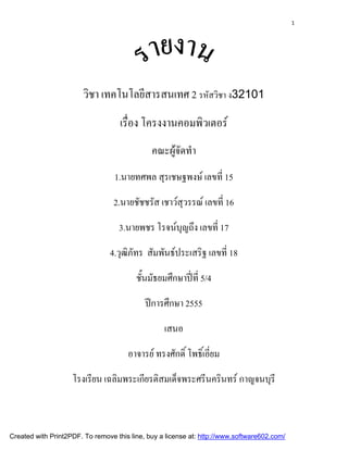 คํานํา รายงานเรื่ อ ง โครงงานคอมพิ ว เตอร นี้ เ ป น ส ว นหนึ่ ง รายวิ ช าเทคโนโลยี สารสนเทศ มีจุดประสงคเพื่อศึกษาความรูเกี่ยวกับโครงงานคอมพิวเตอรซึ่งรายงาน ฉบั บ นี้มีเนื้อหาเกี่ ยวกั บโครงงานคอมพิ ว เตอรการจั ด ทํารายงานฉบับนี้สํา เร็ จ ตาม วัตถุประสงคไปดวยดี ขาพเจาขอขอบพระคุณอาจารย ทรงศักดิ์ โพธิ์เอี่ยม ที่ทานไดให คําแนะนําการเขียนรายงานจนทําใหรายงานฉบับนี้สมบูรณในดานแผนปฏิบัติศึกษา การทํารายงาน การเรียบเรียงเนื้อหา การเขียนบรรณานุกรมไดสําเร็จลุลวงไปดวยดี ขาพเจาหวังวา เนื้อหาในรายงานฉบับนี้ที่ไดเรียบเรียงมาจะเปนประโยชนตอผูสนใจ เปน อยางดี หากมีสิ่งใดในรายงานฉบับนี้จะตองปรับปรุง ขาพเจาขอนอมรับในขอ ชี้แนะและจะนําไปแกไขหรือพัฒนาใหถูกตองสมบูรณตอไป คณะผูจดทํา ั วันที่ 18 มิถนายน 2555 ุ Created with Print2PDF. To remove this line, buy a license at: http://www.software602.com/