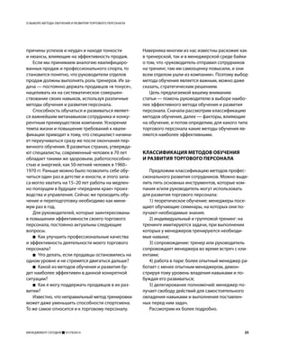 Статья посвящена выбору эффективных методов обучения и развития персонала в области продаж, сравнивая продавцов с высококвалифицированными спортсменами. Представлена классификация методов обучения, включая теоретическое обучение, тренинги, сопровождение и делегирование полномочий. Обсуждаются ключевые вопросы, которые могут помочь руководителям улучшить профессиональные качества и эффективность своих сотрудников.