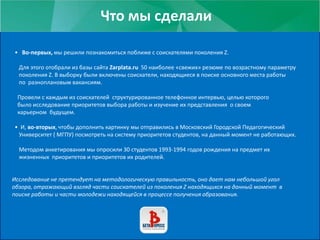 Документ исследует приоритеты и взгляды соискателей поколения Z через структурированные телефонные интервью и анкетирование студентов. Основные факторы выбора работы включают удаленность, заработную плату и график, при этом лишь 10% респондентов заинтересованы в получении опыта. Также замечено, что молодые люди равняют успех не только с доходом, но и с личными и эмоциональными критериями, и определяют себя через мобильность и технологичность.