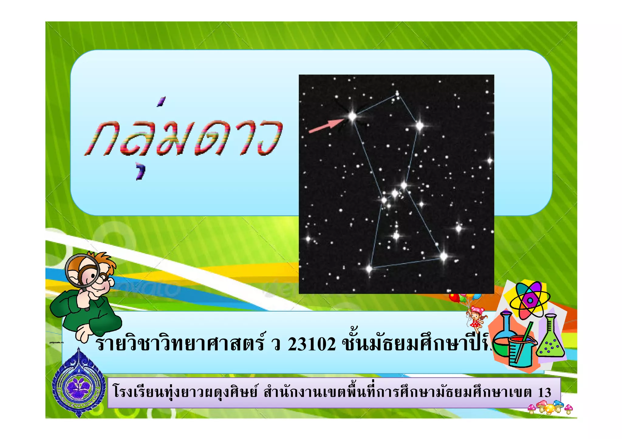 และจะมีรูปร่างของกลุ่มดาว เหมือนเดิมตลอดชีวิตของเรา คือระยะเชิงมุมระหว่าง ดาวจะมีค่าคงที เมือสังเกตกลุ่มดาวจากโลกจะเห็นว่า 1313โรงเรียนทุ่งยาวผดุงศิษย์ สํานักงานเขตพืนทีการศึกษามัธยมศึกษาโรงเรียนทุ่งยาวผดุงศิษย์ สํานักงานเขตพืนทีการศึกษามัธยมศึกษาเขตเขต 1313 เหมือนเดิมตลอดชีวิตของเรา คือระยะเชิงมุมระหว่าง ดาวจะมีค่าคงที เมือสังเกตกลุ่มดาวจากโลกจะเห็นว่า ดาวอยู่ห่างจากเราเท่า ๆ กัน แต่ในความเป็ นจริงแล้ว ดาวอยู่ห่างกันมาก และดาวแต่ละดวงอยู่ห่างจากโลก ต่างกัน