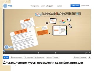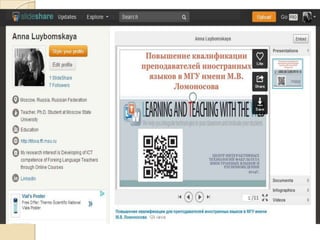 Документ описывает создание профессионально ориентированного пространства для педагогов с использованием веб 2.0 и социальных технологий. Он охватывает разнообразные инструменты и сервисы, такие как блоги, социальные сети и облачные хранилища, которые могут помочь в повышении квалификации и самообразовании педагогов. Основное внимание уделяется функциональным возможностям этих инструментов для взаимодействия, организации работы и разработки учебных материалов.