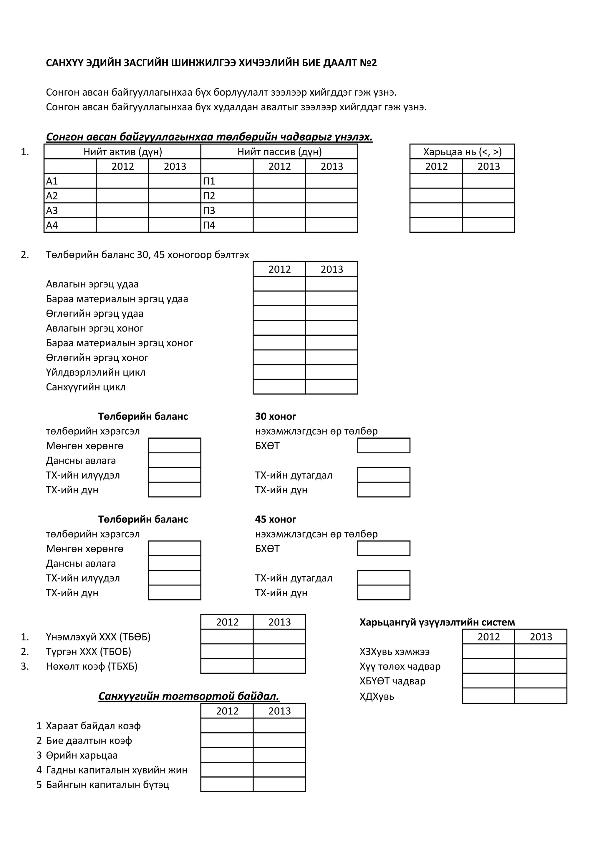ШИНЖИЛГЭЭ ХИЧЭЭЛИЙН БИЕ ДААЛТ №2 Сонгон авсан байгууллагынхаа бүх борлуулалт зээлээр хийгддэг гэж үзнэ. Сонгон авсан байгууллагынхаа бүх худалдан авалтыг зээлээр хийгддэг гэж үзнэ. Сонгон авсан байгууллагынхаа төлбөрийн чадварыг үнэлэх. 1. 2012 2013 2012 2013 2012 2013 А1 П1 А2 П2 А3 П3 А4 П4 2. Төлбөрийн баланс 30, 45 хоногоор бэлтгэх 2012 2013 Авлагын эргэц удаа Бараа материалын эргэц удаа Өглөгийн эргэц удаа Авлагын эргэц хоног Бараа материалын эргэц хоног Өглөгийн эргэц хоног Үйлдвэрлэлийн цикл Санхүүгийн цикл Төлбөрийн баланс 30 хоног төлбөрийн хэрэгсэл нэхэмжлэгдсэн өр төлбөр Мөнгөн хөрөнгө БХӨТ Дансны авлага ТХ-ийн илүүдэл ТХ-ийн дутагдал ТХ-ийн дүн ТХ-ийн дүн Төлбөрийн баланс 45 хоног төлбөрийн хэрэгсэл нэхэмжлэгдсэн өр төлбөр Мөнгөн хөрөнгө БХӨТ Дансны авлага ТХ-ийн илүүдэл ТХ-ийн дутагдал ТХ-ийн дүн ТХ-ийн дүн 2012 2013 Харьцангуй үзүүлэлтийн систем 1. Үнэмлэхүй ХХХ (ТБӨБ) 2012 2013 2. Түргэн ХХХ (ТБОБ) ХЗХувь хэмжээ 3. Нөхөлт коэф (ТБХБ) Хүү төлөх чадвар ХБҮӨТ чадвар Санхүүгийн тогтвортой байдал. ХДХувь 2012 2013 1 Хараат байдал коэф 2 Бие даалтын коэф 3 Өрийн харьцаа 4 Гадны капиталын хувийн жин 5 Байнгын капиталын бүтэц Нийт актив (дүн) Нийт пассив (дүн) Харьцаа нь (<, >)