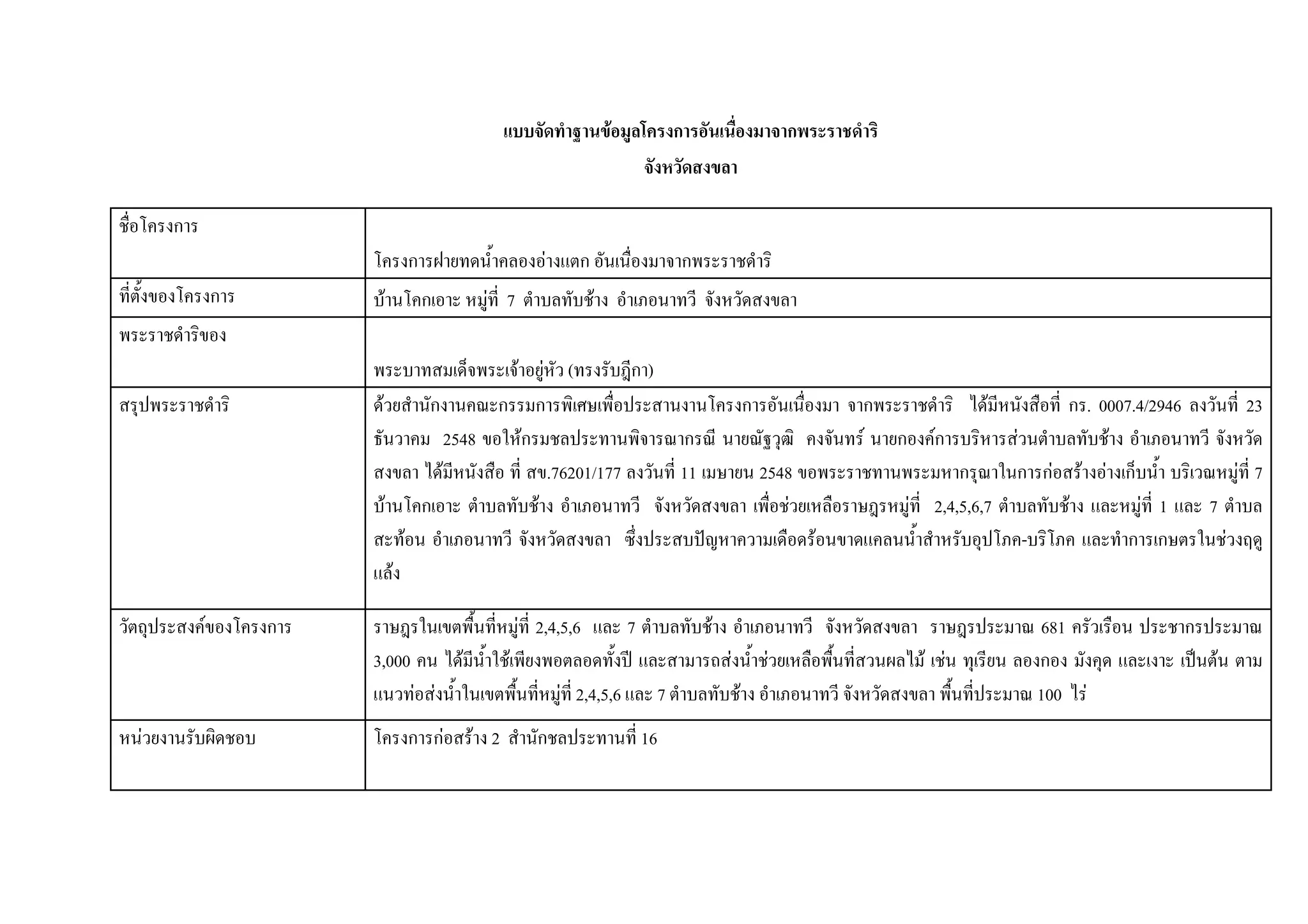 แบบจัดทําฐานขอมูลโครงการอันเนื่องมาจากพระราชดําริ จังหวัดสงขลา ชื่อโครงการ โครงการฝายทดน้ําคลองอางแตก อันเนื่องมาจากพระราชดําริ ที่ตั้งของโครงการ บานโคกเอาะ