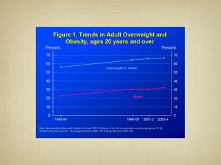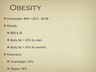 The document discusses obesity, weight loss, exercise, and weight gain. It defines obesity metrics and provides US obesity statistics. Weight loss occurs through caloric imbalance where energy expenditure exceeds energy intake. Exercise alone is less effective for weight loss than diet alone but is important for maintaining lost weight. Weight gain results from sustained caloric surplus where intake exceeds expenditure. Genetics also influence body type and predisposition to gain or lose weight.