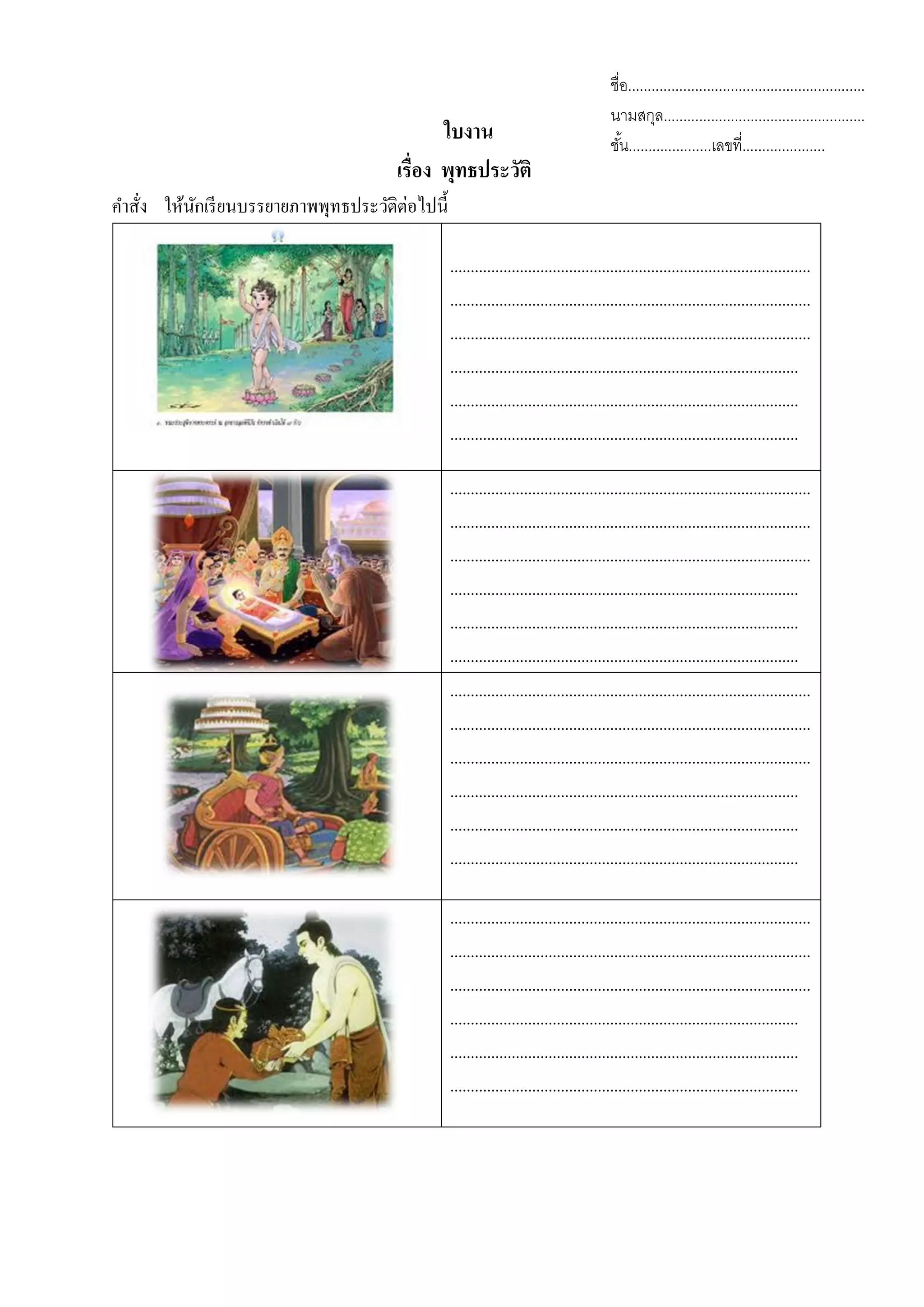 The document is a worksheet titled 'Buddha's Biography' that instructs students to describe images related to the Buddha's life. It contains numerous blanks for students to fill in their answers, indicating it is an interactive assignment. It also requires students to provide their name, surname, class, and student number.