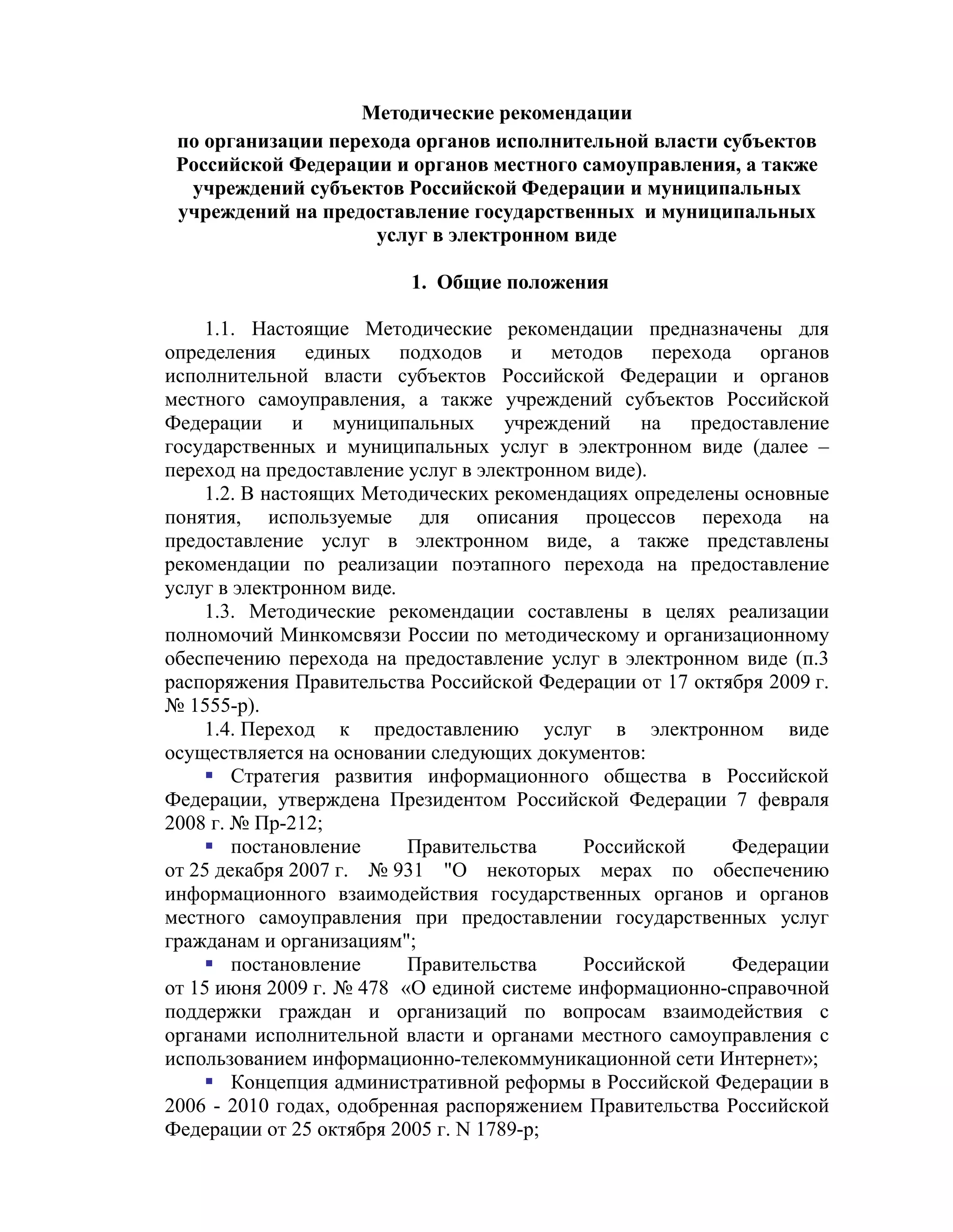 Данный документ содержит методические рекомендации по организации перехода российских органов власти и учреждений на предоставление государственных и муниципальных услуг в электронном виде. Он включает описание основных понятий, поэтапный план перехода, организационную структуру и необходимые документы для успешной реализации электронных услуг. Рекомендации направлены на единообразие и эффективность процесса информатизации и предоставления услуг гражданам.