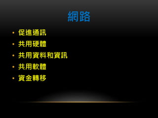 文档介绍了网络的基本组成和架构,包括LAN、MAN和WAN的定义,以及主从式和对等式网络的运作方式。还详细说明了服务器与客户端的角色及其在网络中的功能。总体上,文档阐述了网络通讯的基本原理和各组件的互动。