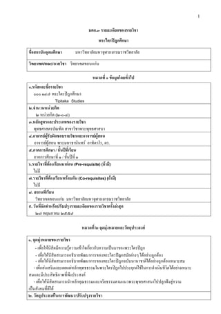 วิทยาเขตขอนแกน หมวดที่ ๑ ขอมูลโดยทั่วไป ๑.รหัสและชื่อรายวิชา ๐๐๐ ๑๔๗ พระไตรปฎกศึกษา Tipitaka Studies ๒.จํานวนหนวยกิต ๒ หนวยกิต (๒-๐-๔) ๓.หลักสูตรและประเภทของรายวิชา พุทธศาสตรบัณฑิต สาขาวิชาพระพุทธศาสนา ๔.อาจารยผูรับผิดชอบรายวิชาและอาจารยผูสอน อาจารยผูสอน พระมหาธานินทร อาทิตวโร, ดร. ๕.ภาคการศึกษา / ชั้นปที่เรียน ภาคการศึกษาที่ ๑ / ชั้นปที่ ๑ ๖.รายวิชาที่ตองเรียนมากอน (Pre-requisite) (ถามี) ไมมี ๗.รายวิชาที่ตองเรียนพรอมกัน (Co-requisites) (ถามี) ไมมี ๘. สถานที่เรียน วิทยาเขตขอนแกน มหาวิทยาลัยมหาจุฬาลงกรณราชวิทยาลัย ๙. วันที่จัดทําหรือปรับปรุงรายละเอียดของรายวิชาครั้งลาสุด ๒๗ พฤษภาคม ๒๕๕๗ หมวดที่ ๒ จุดมุงหมายและวัตถุประสงค ๑. จุดมุงหมายของรายวิชา - เพื่อใหนิสิตมีความรูความเขาใจเกี่ยวกับความเปนมาของพระไตรปฎก - เพื่อใหนิสิตสามารถอธิบายพัฒนาการของพระไตรปกกสมัยตางๆ ไดอยางถูกตอง - เพื่อใหนิสิตสามารถอธิบายพัฒนาการของพระไตรปฎกฉบับนานาชาติไดอยางถูกตองเหมาะสม - เพื่อสงเสริมและเผยแผหลักพุทธธรรมในพระไตรปฎกไปประยุกตใชในการดําเนินชีวิตไดอยางเหมาะ สมและมีประสิทธิภาพที่พึงประสงค - เพื่อใหนิสิตสามารถนําหลักคุณธรรมและจริยธรรมตามแนวพระพุทธศาสนาไปปลูกฝงสูความ เปนสังคมที่ดีได ๒. วัตถุประสงคในการพัฒนา/ปรับปรุงรายวิชา