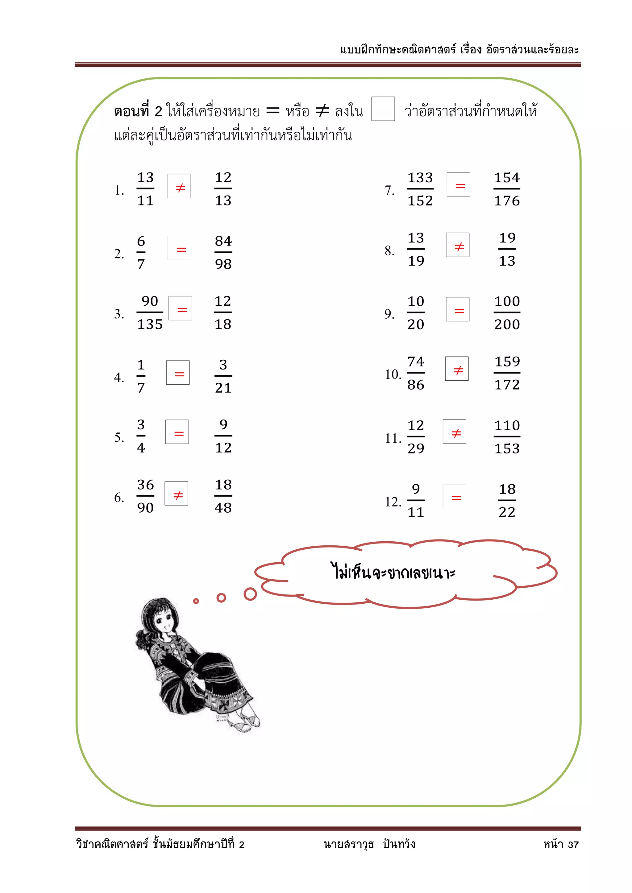 ชั้นมัธยมศึกษาปีที่ 2 นายสราวุธ ปันทวัง หน้า 37 ตอนที่ 2 ให้ใส่เครื่องหมาย หรือ ลงใน ว่าอัตราส่วนที่กาหนดให้ แต่ละคู่เป็นอัตราส่วนที่เท่ากันหรือไม่เท่ากัน 1. 2. 3. 4. 5. 6. 7. 8. 9. 10. 11. 12. ไม่เห็นจะยากเลยเนาะ